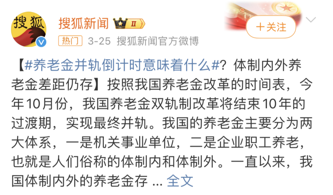 “您的退休金,可能会因为一项即将到来的政策变革而受到影响!” 随着2024年10月的临近,养老金并轨政策的倒计时已经响起。 这不仅是国家养老保险体系的重大调整,更关乎每一位职工未来的养老福利。 体制内外的待遇差异,一直是社会关注的焦点,而并轨政策的实施,将如何重新定义我们的退休生活? 特地写一篇文,用最简短的话给你讲清楚,事关你我。 ![]() Part.01 并轨时代:退休金的未来 退休生活的安稳与否,直接关系到每位职工的心。 但一个不容忽视的现实是,我国养老金制度长期存在的“双轨制”导致了体制内外退休待遇的显著差异。 体制内的养老金替代率较高,基本跟在职时的水平差不多,至少也有80%-90%以上,从体制内退休的老人生活过得相当滋润。 而体制外的养老金替代率较低,据粗略计算,目前在40%左右,已低于国际上建议的最低标准,这也解释了退休老人再就业的原因。 ![]() 这种差异不仅加剧了社会分层,也给未来的养老安全埋下了隐患。 在这样的背景下,养老金并轨政策应运而生,它被寄予厚望,旨在打破旧有的制度壁垒,实现养老待遇的公平化。 然而,这一改革并非没有挑战。随着经济的发展和人口结构的变化,养老金的可持续性问题日益凸显。 如何在保障退休人员基本生活的同时,确保养老金制度的长期稳定,成为了摆在政策制定者面前的难题。 养老金并轨,不仅是对现有制度的一次重大手术,更是对未来养老模式的一次深思熟虑。 它将如何平衡不同群体的利益,如何适应人口老龄化的挑战,如何确保每位职工都能有一个安稳的晚年? 这些问题的答案,不仅关乎政策的成败,更关乎我们每个人的切身利益。 Part.02 并轨变革:退休金差异的终结? 养老金的改革正逐步重塑我们的退休预期,而这一进程,对不同群体意味着不同的未来。 在2014年10月之前,体制内职工的退休金由国家全额支付,但随着并轨政策的推进,这一模式已经走进了历史。 过渡期的退休者,虽然受到政策的保护,但过渡期结束后,所有机关事业单位的员工将与企业员工一样,根据统一的规则缴纳养老保险。 目前,我们正处于一个关键的转型时期。 事业单位的新职工,自2014年10月之后,已经开始按月缴纳养老保险,这标志着单轨制的全面铺开。 过渡期的结束,预示着我国养老保障制度的统一化,这不仅是对制度的革新,也是对公平与效率的追求。 尽管如此,要实现结构性公平,我们还有很长的路要走。 我国的养老体系,由三大支柱构成: ![]() 养老体系的三大支柱中,第一支柱的基本养老金制度调整,以及第二支柱的职业年金的引入,都在努力减少体制内外养老金的差距。 但企业年金的覆盖率相对较低,且在当前经济环境下,企业自愿缴纳的意愿并不强烈。 ![]() 根据国家统计局的数据,体制内职工的平均收入普遍高于体制外职工,这直接影响了他们的缴费基数和未来的养老金收入。 因此,尽管养老金的计算和缴纳方式正在趋于公平,但要真正实现养老金替代率的公平,还需要更多的努力。 面对这一现实,我们不得不思考个人的未来规划。 在养老金并轨的新格局下,如何制定合理的退休策略,确保退休生活的稳定和尊严,成为我们必须面对的问题。 Part03 不同人群的养老金变化 随着养老金并轨政策的落地,一个时代的退休金差异即将被抹平。 但在这历史性的一刻,不同人群的养老金将面临怎样的变局?对于“老人”、“中人”和“新人”来说,这场改革带来的是机遇还是挑战? “老人”,即那些在2014年10月之前退休的职工 他们的退休金不会受到并轨政策的影响,依旧享受着旧制度下的安稳。 对于那些处于过渡期的“中人” 他们的退休金将根据“限低从高”的原则进行调整,这或许意味着一部分人的退休金将得到提升,但是否每个人都能从中受益? 对于“新人”,即2014年10月之后参加工作的职工 他们将完全按照新的养老保险制度来计算退休金。 这意味着,无论体制内外,退休金的计算方式都将统一。 但是,统一的计算方式是否能够保证退休金的公平分配? 在经济增速放缓、人口老龄化加剧的背景下,退休金的增长是否能够跟上物价上涨的步伐? 我们的退休金,是否真的能够成为晚年生活的坚实保障?在养老金并轨的大潮中,每个人的命运都将被重新书写。 接下来,我们将深入探讨不同人群在养老金并轨后的具体变化,以及这些变化对您未来生活的影响。让我们一起揭开养老金并轨背后的真相,为规划一个安心的退休生活迈出关键一步。 Part.04 并轨后养老:挑战与对策 随着养老金并轨政策的尘埃落定,我们站在了一个新的起点上。 但这仅仅是个开始,因为养老金的未来远比我们想象的要复杂。 并轨政策的实施,虽然在制度层面实现了统一,但它并非解决养老问题的良药。 面对人口老龄化和经济增长放缓的双重挑战,我们的养老金真的安全吗? 首先,我们必须认识到,人口结构的变化对养老金的影响是深远的。 ![]() 当前,我国人口出生率的下降和老年人口比例的上升,共同构成了一个不容忽视的现实:养老金的缴纳者在减少,而领取者在增加。 这一增一减之间,养老金的资金池面临着越来越大的压力。 ![]() 其次,我们不能单纯依赖国家或企业提供的养老保障。在第一支柱和第二支柱之外,激活第三支柱——商业养老保险,成为了一个值得考虑的选择。 通过个人参与商业养老保险,我们可以为自己的退休