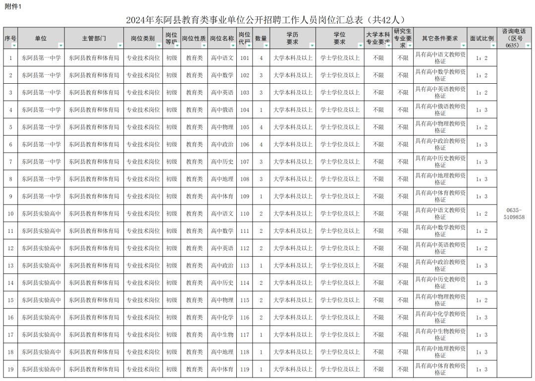 2024年东阿县教育类事业单位公开招聘工作人员简章根据《事业单位人事管理条例》(国务院令第652号)、《事业单位公开招聘人员暂行规定》(人事部令第6号)等规定,经县委、县政府研究同意,现将2024年东阿县教育类事业单位公开招聘工作人员的有关事项公告如下:(一)具有中华人民共和国国籍; (二)遵守宪法和法律; (三)具有良好的道德品行和适应岗位的身体条件; (四)具有招聘岗位要求的专业或技能条件; (五)年龄在40周岁以下(1983年5月14日以后出生);取得高级工、预备技师职业资格的高级技校或技师学院全日制毕业生,可分别按照全日制高职(大专)、本科毕业生应聘符合条件的岗位;在读全日制普通高等院校非应届毕业生不能应聘,也不得以已取得的学历学位作为条件应聘;有违法犯罪记录及曾受过刑事处罚和曾被开除公职的人员不能应聘;被依法列为失信联合惩戒对象的人员不能应聘;现役军人及法律规定不得聘用的其他情形的人员不能应聘;应聘人员不得报考有《事业单位人事管理回避规定》(人社部规〔2019〕1号)规定情形的岗位。具体招聘单位、招聘岗位、招聘人数及条件要求见附件1。 报名时间:2024年5月14日9:00 — 5月16日17:00查询时间:2024年5月14日11:00 —5月17日11:00应聘人员登录东阿政务网(http://www.sdde.gov.cn/),仔细阅读《简章》及所有附件,并如实提交相关个人信息资料。每人限报一个岗位,岗位一经初审通过,不能更改。报名必须使用第二代身份证,与考试时的身份证应当一致。对恶意注册报名信息、扰乱报名秩序的,取消其报考资格。报名人员在应聘期间的表现,将作为公开招聘考察的重要内容之一。初审时间:2024年5月14日11:00 — 5月17日11:00 招聘单位或其主管部门指派专人负责资格初审工作(节假日不休息),并在网上公布初审确认结果。资格初审通过,报名信息不能更改。由于报名信息涉及个人隐私,网上报名期间招聘单位无法直接获得报名人员联系方式,报名时间截止后,考生将无法修改报名信息,请应聘人员尽早报名并及时查询资格初审结果,如有疑问请主动联系招聘单位。缴费时间:2024年5月14日11:00 —5月17日17:00通过网上资格初审的人员,要在规定时间内登录报名网站进行网上缴费,逾期未缴费的,视为放弃应聘。根据(鲁发改成本〔2022〕55号)核定的标准,笔试考务费为每人每科40元。享受减免考务费用的应聘人员,在通过资格初审后,于5月14日9:00--5月17日11:00的工作时间内,将减免材料(见《应聘须知》)扫描后,发送至邮箱dexrsjsyk@lc.shandong.cn并拨打电话0635-3289054进行确认,在规定时间内未办理确认且未缴费的视为放弃。报名结束后,对应聘人数达不到规定比例的招聘岗位,计划招聘1人的,取消招聘岗位;计划招聘2人以上的,按规定的比例相应核减招聘计划。取消招聘计划的岗位,其应聘人员如符合其他职位的招聘条件,可在规定的时间内改报其他符合条件的岗位。请报名人员在确认缴费后,注意关注取消岗位公告,并保持联系方式畅通。缴费成功人员登录报名网站打印准考证,打印时间另行通知。同时一并打印《报名登记表》和《诚信承诺书》(面试资格审查时使用)。笔试内容为教学基础知识(包括教育学、心理学、教育法律法规等)和学科专业知识(包括学科素养、运用学科知识分析和解决教育教学实际问题的能力)两部分,分别占整个试题分数的40%和60%。为保证新进人员基本素质,笔试设定最低合格分数线,由县事业单位公开招聘主管机关根据岗位招聘人数和笔试情况确定。笔试时间:2024年5月25日上午 9:00—11:30面试人选从达到笔试合格分数线的应聘人员中,根据招聘岗位和招聘人数由高分到低分按规定比例依次确定,并按规定程序面向社会公布。笔试合格人数出现空缺的岗位,取消招聘计划;达不到规定招聘比例的,按实有合格人数确定。取得面试人选资格的应聘人员,须在规定时间内提交本人相关证明材料,未在规定时间提交材料的,视为放弃。经审查,符合招聘条件的应聘人员,缴纳面试考务费70元,并自行打印《面试通知书》。不符合条件的取消面试资格,因弃权或取消资格造成的岗位空缺,按笔试成绩依次递补。对应聘人员的资格审查贯穿于招聘工作全过程。凡提报有关材料信息不实,影响资格审查结果的,县公开招聘主管机关取消其面试资格。面试工作由县公开招聘主管机关统一组织实施。面试具体时间、地点、方式另行通知。为保证新进人员基本素质,面试时设定面试合格分数线,达不到合格分数线的取消聘用资格。面试结束后,按笔试成绩、面试成绩各占50%的比例,采用百分制计算应聘人员考试总成绩。笔试成绩、面试成绩、考试总成绩均计算到小数点后两位数,尾数四舍五入。根据考试总成绩和招聘岗位,从高分到低分按1:1的比例等额确定考察体检人员。同一岗位应聘人员出现总成绩并列的,按笔试成绩由高分到低分确定人选,笔试成绩仍相同的,采取加试的办法确定。考察体检人员确定后,由县事业单位公开招聘主管机关按照有关规定统一安排。考察工作在县事业单位公开招聘主管机关统一安排下,由招聘单位或其主管部门负责组织实施。考察时,成立考察工作小组,具体负责考察工作。考察根据岗位条件要求采取多种方式进行,全面了解应聘人员思想政治表现、道德品质、业务能力和工作实绩等方面情况,并对应聘人员是否符合规定