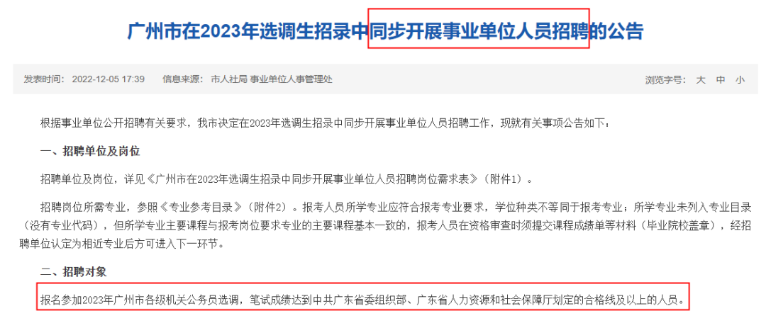 这类招聘在广东比较多,比如 广州市2023年选调生招录中同步开展事业单位人员招聘 ,招聘对象: 报名参加2023年广州市各级机关公务员选调,笔试成绩达到中共广东省委组织部、广东省人力资源和社会保障厅划定的合格线及以上的人员。图源:2023年广东省 选调生招录中同步开展事业单位人员招聘 公告所以,在此提醒大家,像国考、省考、事业单位等相关大型考试,能报考的一定要报考,能参加一定要参加!综上,想进入事业单位,形式有很多种,挑选自己适合的能大大提高上岸率。我的《梁易结构化申论讲义》,就是从申论考情走向出发,再拆分到各基础知识点的重要考点!事业单位申论考试可以学习,文末直接领取电子讲义。