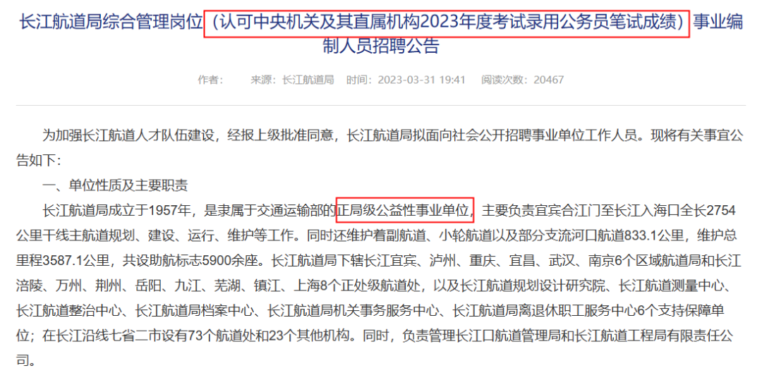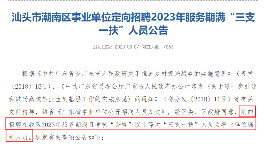 相较于公务员,事业单位每年招聘上岸机会多一些,事业单位招聘有很多种,下面雷宝为大家盘点一下事业单位的各种招聘,看看你更适合哪种吧。就是大家比较熟悉的招聘,比如事业单位联考、统考、某市县统一招聘等,还有各单位单独招考。这一类招聘大家见得也比较多,主要招聘高层次或紧缺人才。优势: 招聘人数也较多,待遇比普通招聘丰厚, 还能享受各种人才补贴。定向(专项)招聘是指专门针对某一类人群的招聘考试,会标明招聘群体,以2023年广东省汕头市潮南区2023年事业单位定向招聘为例,就是面向服务期满“三支一扶”人员。常见的定向人群有: “四项目”服务期满且合格的人员、应届毕业生、退役大学生士兵、转业军人、社区工作者、扶贫专干、网格员、大学生村官、优秀村干部、师范医疗定向委培生、随军家属、退役运动员等 。优势: 对于定向人群来说就 是“量身打造”,上岸率相对较高一些。 图源:2023年广东汕头市潮南区事业单位定向招聘公告除了公务员,事业单位也有“选调生”。部分地区会针对优秀大学生招聘, 作为事业单位储备人才和优秀青年干部重要来源 。被录用的人员可以享受重点培养及多重优厚待遇。 图源:2023年山东青岛莱西市事业单位选调生招聘公告参加过事业单位统考的小伙伴或许还有可能拿着“成绩单”再应聘一次事业单位,你知道吗?比如上海海关事业单位2023年公开招聘对象:参加过2023年上海市事业单位公开招聘集中笔试, 达到全市平均成绩102.9分 ,招聘岗位要求具备博士学位的除外。 使用国考成绩招聘的事业单位较为少见,但也不是没有。以2023年长江航道局综合管理岗位招聘为例:招聘对象需参加中央机关及其直属机构2023年度考试录用公务员笔试, 笔试总分不低于105分,且行政职业能力测验不低于60分 。