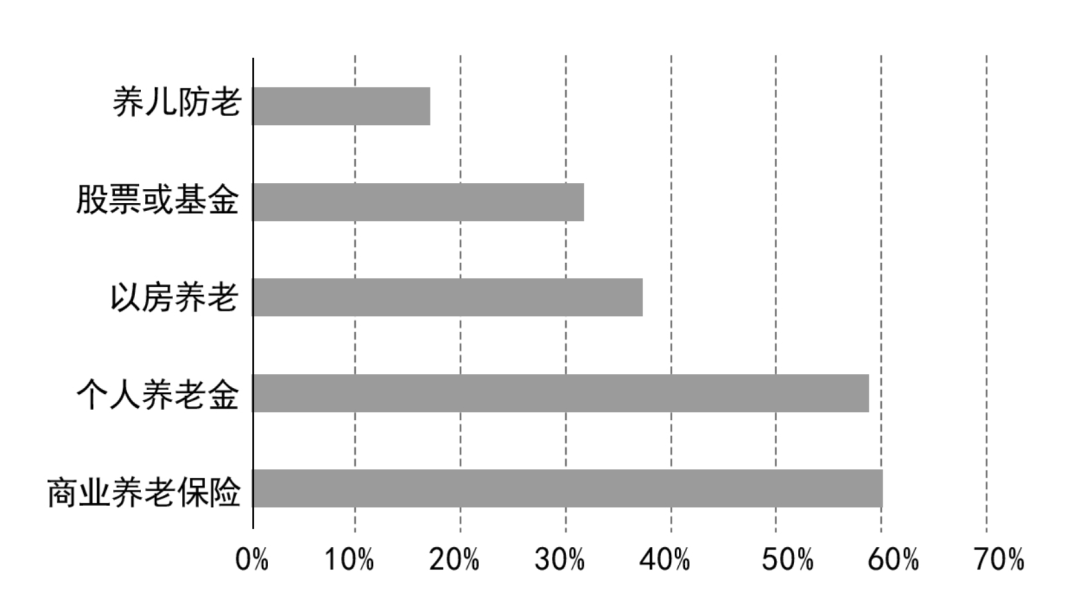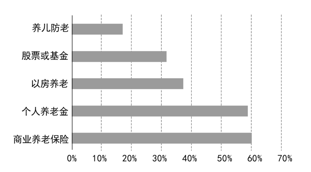 其实很多人已经意识到养老金不足的紧迫性。一项问卷调研结果(3860份有效问卷)显示,在当前家庭资产配置的多项资产中,在“未来养老准备项目”这一问题上,养儿防老的选择率仅占16%;然后是股票或基金等投资养老、及以房养老;而居民期望养老资金来源占比最高的方式,就是商业养老保险,占比高达60%。