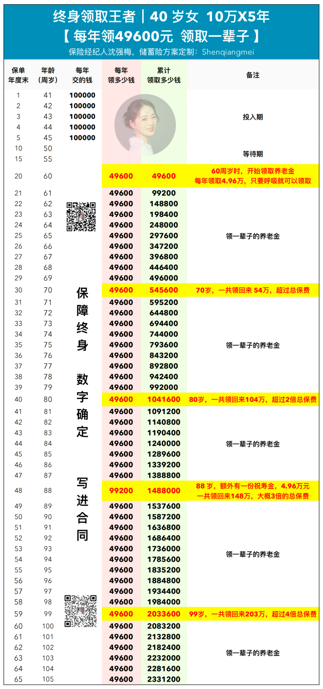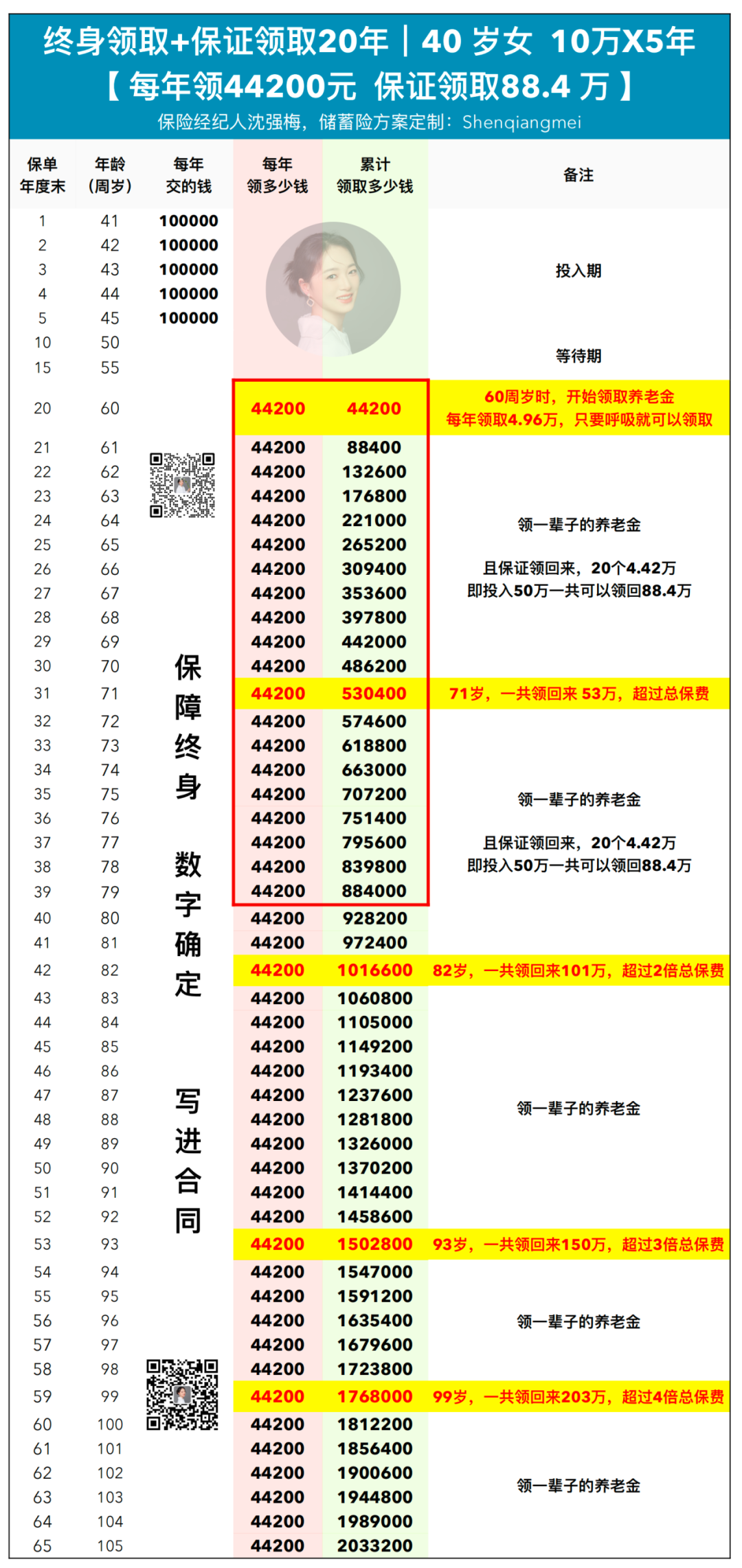 例如:一个以40岁女性10万x5年交,