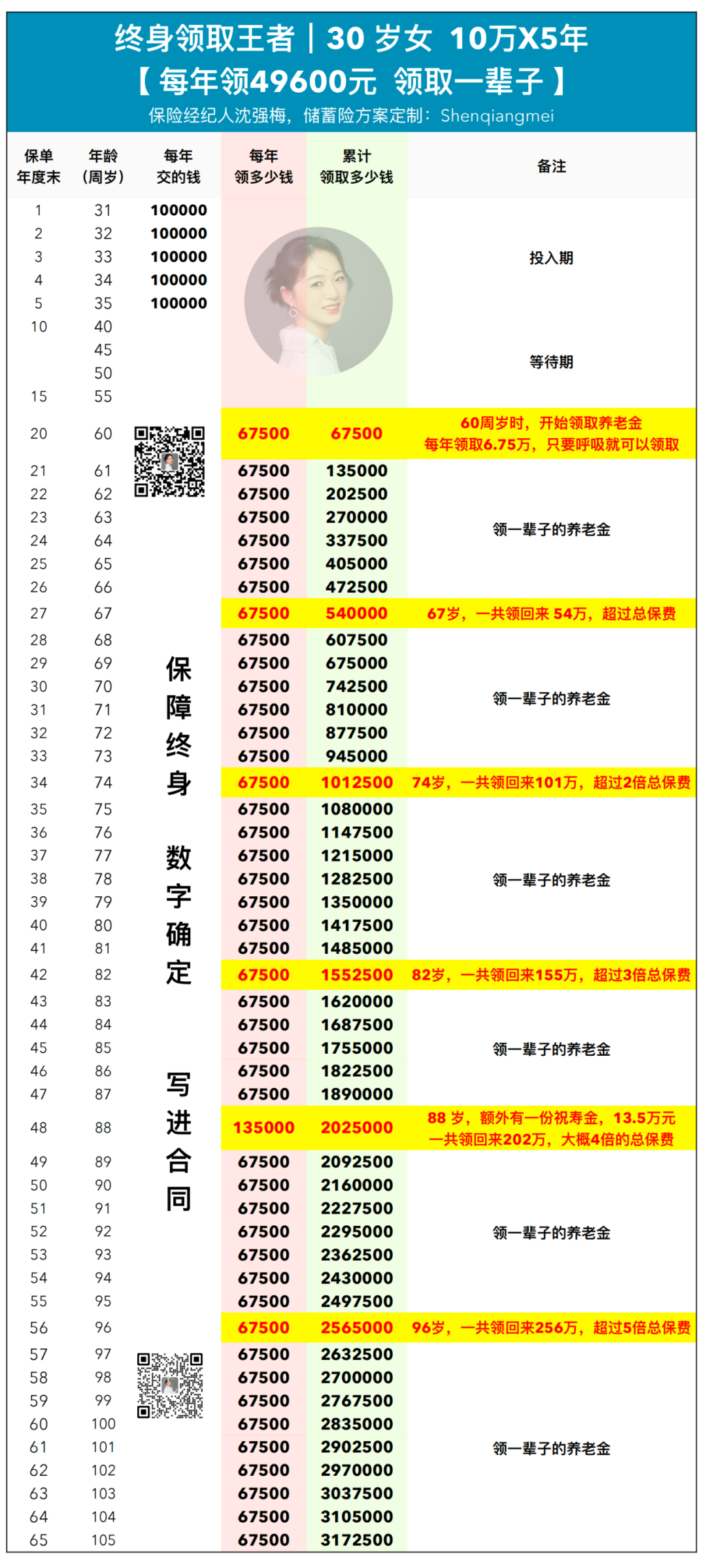 88岁时,额外有一份祝寿金6.75万,一共领202万,超过是4倍的总保费
