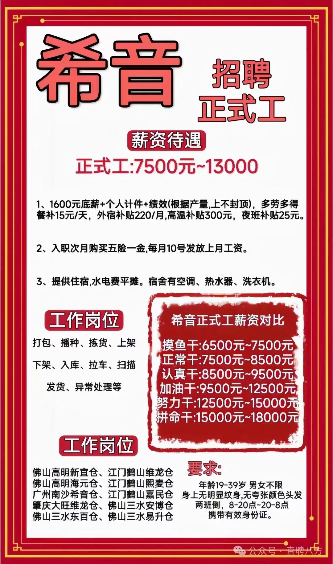 @所有人5月15日希音正式工 1.佛山高明嘉民 2.佛山高明新宜 3.江门鹤山片区 4.肇庆大旺片区 5.惠州博罗仓 6.广州南沙仓 以上仓库都在安排 1.佛山高明嘉民仓 2.江门鹤山维龙仓 3.江门鹤山嘉民仓 4.江门鹤山熙麦仓 5.广州南沙保税港仓 6.佛山高明新宜仓 7.肇庆大旺维龙仓 一、5.13大旺片区长期工面试安排:(需要预约,发名字和电话号码给冼小姐或者何生) 【招聘岗位信息会在当天上午9.30分前更新】 【当天面试结果会在晚上11点前发送短信通知】 面试要求: 1.面试要求:优先安排19-40岁,适应两班倒,能吃苦耐劳; 2.面试资料:携带身份证有效原件(手机保持充足电量); 3.入园要求:不能穿短裤、拖鞋,园区内不能抽烟; 4.薪资待遇:底薪1600+绩效/计件=综合薪资6000-9000,提供住宿,如外宿补贴220/月,餐补15元/人/天(当天满勤,次日发放),夜班补贴25元/晚,入职次月购买五险一金,有班车接送,入职前公司安排免费体检等。 |