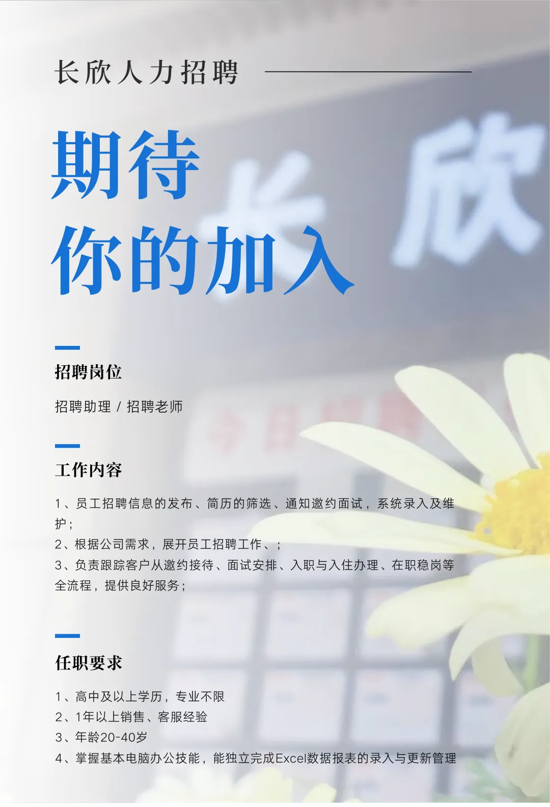 ![]() ![]() ![]() ![]() 公司简介 About Us ![]() 长欣人力拥有劳务派遣经营许可证、人力资源服务许可证资质,是一家从事劳务派遣、劳务外包、及其他人力资源相关业务的规模化人力公司。 公司在成都市区、崇州市、郫都区设有办公场所,并在绵阳、珠海、长沙、南京、无锡等地设有办事处。 公司业务合作伙伴遍及四川主要劳务输出市县并拓展至重庆市、陕西省、山西省、甘肃省、河北省、贵州省、云南省等省区。 公司及关联企业系捷普集团、伟创力集团、长虹集团、领益集团等超大型工业制造企业的一级人力资源供应商。 职位招聘助理 Hot positions 01 工作内容 1、员工招聘信息的发布、简历的筛选、通知邀约面试,系统录入及维护 2、根据公司需求,展开员工招聘工作,完成招聘任务 3、负责跟踪客户从邀约接待、面试安排、入职与入住办理、在职稳岗、离职以及新工作介绍、转厂等全流程,提供良好服务 02 任职要求 1、高中及以上学历,专业不限; 2、1年以上销售、客服经验; 3、年龄20-40岁 4、掌握基本电脑办公技能,能独立完成Excel数据报表的录入与更新管理 03 工作地址 1、成都市区新川里(地铁四河) 2、郫都区龙湖时代天街 就近安排面试及工作地点 联系方式 Contact Us 人事电话(微信同号): 13880045589