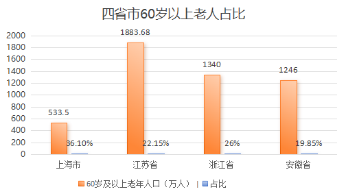 在全国范围内,长三角地区老龄化社会速度较快,发展程度也较高,整体已进入人口加速老龄化阶段。