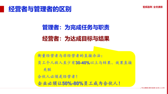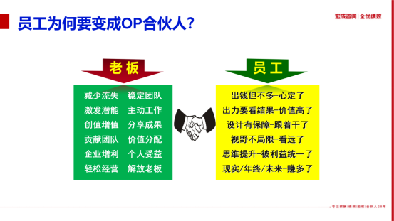 OP合伙人模式把员工变成经营者,让员工适当参与企业的经营 1、员工拿的是工资,合伙人拿的是分红; 2、无论公司经营好坏,员工照拿工资,但合伙人只在经营好的情况下才能获得分红; 3、合伙人打造合力文化,让员工为自己干也为团队和平台干; 4、让员工的收入从利前(成本),逐步转向利后(资本);