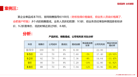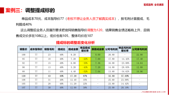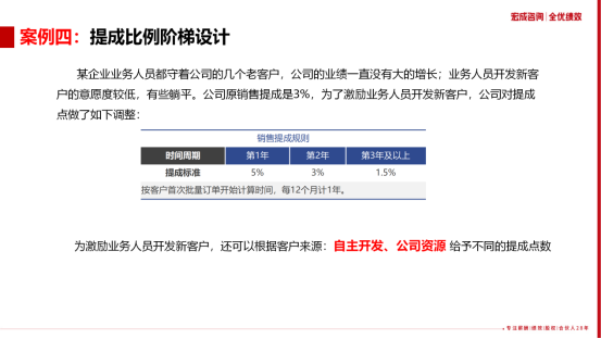设计更符合企业经营需求的提成标的,能有效地解决上述问题的1,2,3点,假设把提成标的设为:毛利润; 并把毛利润计算公式设为: 毛利润=销售额-产品成本-销售费用(要明确哪些费用,不要包含固定费用) 这样能很好就解决员工底价成交,销售费用不管不顾的问题,给大家分享一个案例,作为参考: 上述案例中业务员只守着几个老客户,开发新客户的意愿低迷,这个问题如何通过提成设计来解决,其实可以对新老客户分别设置不同的提成点数,来激发业务员开发新客户的动力: