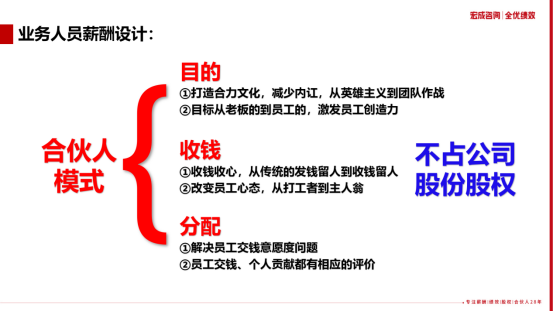 小结: 提成设计的方式还有很多,每种提成方式都有其利弊,本文仅以常用的提成模式给大家一些设计思路,还有阶梯提成也是比较常见的,当然设计不好也有其弊端,会造成诸如:拼单、压单的现象;结果总体业绩没上去,企业发的提成却变多了;所以提成设计需谨慎。 注:案例三、与案例四、五并非同一家企业,大家可以借鉴,切勿生搬硬套。 【三】合伙篇 业务员在很多企业无疑是核心岗位,尤其是业绩好的业务员那更是老板的心头肉,这就导致很多老板对业务员既有期待又有担忧,总结归纳大概有以下几点: 1、希望业务员好好干,把业绩冲得高高的,把老板目标当成自己的目标; 2、希望老业务员能够主动担当把新人带起来; 3、希望有能力的业务员能够分享销售心得、话术,让能力弱业务模仿成长; 4、担心优秀骨干业务流失,更担心这帮人成了同行; 既然老板对业务员有这些期待和担忧,那业务员想要什么呢?大多数业务员对收入是有期待的;还有部分业务对参与企业的经营也非常感兴趣(这个和年龄有关),当然收入也要兼顾。所以很多老板就开始想招了,譬如:年底发提成,发分红,发年终奖,发双薪等等各种招数花样百出;但效果差强人意,治标不治本。为什么说治标不治本呢,因为企业请员工过来上班不是为了请他吃饭的,而是希望他能够创造价值,但是不管是发分红、年终奖还是发双薪,他更多关注的是留人,而忽略了激励人。 那要如何设计才能实现留人和激励人的效果呢? 以往传统的做法是通过发钱来留人,效果一般,且关注的是留人,激励人的价值并不高,这就和老板的初衷有一定的偏差了;这里和大家分享一个创新型的方法,变发钱留人,为收钱留人,且不管如何收钱,但只要业务员交了钱给公司,他的稳定性是否就有了保障,留人的价值就显现了,比发钱留人更为可靠。 如何向员工收钱?员工又为什么愿意交钱? 这里和大家介绍一种宏成咨询独创的OP合伙人模式: