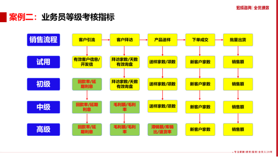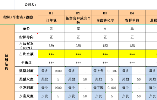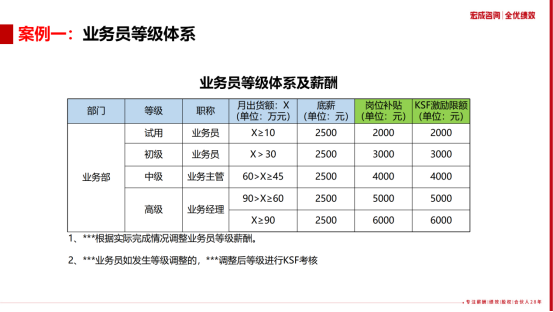 每天聊聊企业家们关注、关心的内容!从阅读中,提升自己,创造未来...欢迎加入我们! 问题:怎么才能每天都收到这种文章呢?? 联系:黄老师139-2808-7493(微信同号) 【一】底薪篇 业务部在很多企业是非常重要的核心部门,企业的业务部门经常会碰到几个大的问题: 1、新的业务员留不住,流失大; 2、老的业务员比较容易躺平,动力不足; 3、为了做业绩,各种送赠、销售费用一路走高; 一、分析以下原因: 1、新业务员留不住,很多企业业务员薪酬模式是底薪加提成,这种设计过于结果化,就是说一个业务员进来之后他要产生了业绩,然后才能去拿到提成;很多企业业务员从入职到做出业绩周期比较长,很多新的业务员可能还没有出业绩,他就已经离职了,甚至有些企业提成也是年底发,那新的业务根本就熬不住;所以,很容易导致新的业务员离职。怎么去解决这个问题呢? 其实可以在底薪上做出一定的设计:增加短期激励,就是说他不一定要真正把东西卖出去了,才有奖励;企业可以销售的一些关键动作量化出来做奖惩,当业务员做好这些关键动作,也可以获得一定的奖励,这样也给业务员指明工作方向;很多新业务工作方向并不清晰,公司给他指明方向,他们也更容易出成绩。 2、老的业务员躺平没动力,因为他们手中往往都有几个相对稳定的大客户,年收入相对可观,部分业务员会产生小富即安的心态,这个时候他动力可能就会有一定的下降;这个其实也要有一定的考核,譬如在新开发客户上做一定的奖惩,还可以在提成的设计方面进行一定的考量; 3、为了做业绩,各种的送赠,这个情况是因为很多企业销售费用跟业务员的利益不相关,只要跟员工利益相关起来,而这个时候他们就会去关注销售费用呢! 二、如何做有效的奖惩设计? 1、缩短考核周期,工资既然是按月发放,考核也应当是按月度进行 2、考核到人,业务员的结果好不好和本人直接相关 3、有奖有罚,奖罚均衡,不要单方面只有奖励或者扣罚 案例:某企业外贸业务员月度KSF薪酬方案 三、如何将“底薪”转化为“KSF薪酬绩效”? 企业有多个业务员,他们业绩不尽相同,甚至差异颇大,能用同样的目标考核吗?新老业务员的能力段不一致,考核指标能一样吗?怎么办? 把业务员做一定的区分,例如:实习业务员(入职1-3月)、正式业务员(4—12个月)、初级业务员、中级业务员、高级业务员等,针对不同等级的业务员给予对应等级的待遇,设定相对应的考核指标及目标,制定合理的考核方案,实现量身定制KSF薪酬方案; 案例:某企业业务员等级体系、等级薪酬、考核指标