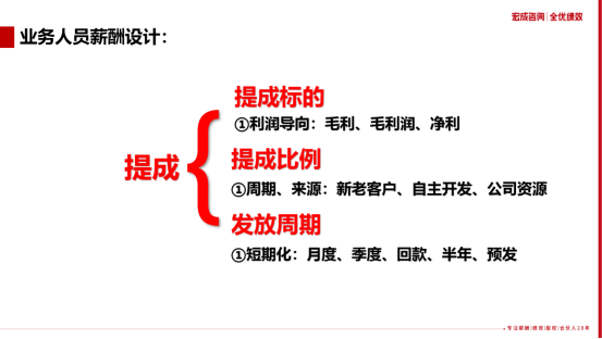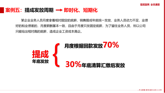 小结: 很多企业的业务员薪酬模式采用:底薪+提成,以为业务员有提成就可以了,从而忽视了其他激励,导致业务员的激励相对单一,没有把业务员的潜能完全激发出来; 企业招聘员工来上班,是要员工创造价值的,不要把底薪做成打卡工资,而是底薪也要有相应的要求,当然不要单方面只有奖励或者扣罚,这样是无法长久的,要奖罚均衡。 【二】提成篇 某企业业务员的工作状态较为低迷,年销售3KW的业务员和年销售200W的业务员的工作状态都差不多;而且业绩高的业务员对业绩低的业务员也没有什么优越感,业绩低的业务员也不羡慕那些优秀的业务员。 经调研得知这家企业的业务员采用底薪加提成的薪酬模式,提成是在年底统一计算并进行发放。每个月是发放相对低的固定底薪2500元,业务员月度日子过得都是相对拮据的;尤其是一些相对优秀的业务,都在做公司好多年,组建了家庭,拿着2500元的月薪还要养家糊口,日子表面上过得比新人还紧张(多年低底薪养成的低消费习惯,并不是没钱)。最终就是整个业务部的人穿得都朴实无比,精神状态也比公司其他部门差了一节。 老板也表示这批业务员现在基本上是守着几个老客户,几年都没开发客户了,平时工作状态低迷,毫无激情可言。谈到提成年底发放时,老板说当时基于两个方面的因素:一是怕业务员不稳定,有一笔钱压在公司,对人员的稳定性有一定保障;二是创业初期没那么多钱,基于公司日常运营资金的考虑;公司现在有近十年,日常运营资金早已经不是问题,只是规则就这么一直延续下来了。 很多企业业务员薪酬模式是:底薪加提成,提成设计是有很多技巧的,如果设计不好,不但没有把员工激励起来,除以上案例弊端之外,还会给企业带来其他方面损失: 1、业务员不跟客户讨价,而跟老板还价; 2、业务员向来只按公司最低指导价报价,每单成交都是踩着公司底线的; 3、样品、运费等销售关联费用一概不管不顾,费用一路走高; 4、业务员只守着几个老客户,开发新客户的意愿低迷。 这些关于提成的问题如何解决: 提成设计要有一个整体布局,不要头痛医头,脚痛医脚,要系统规划尽量规避重大漏洞的出现。