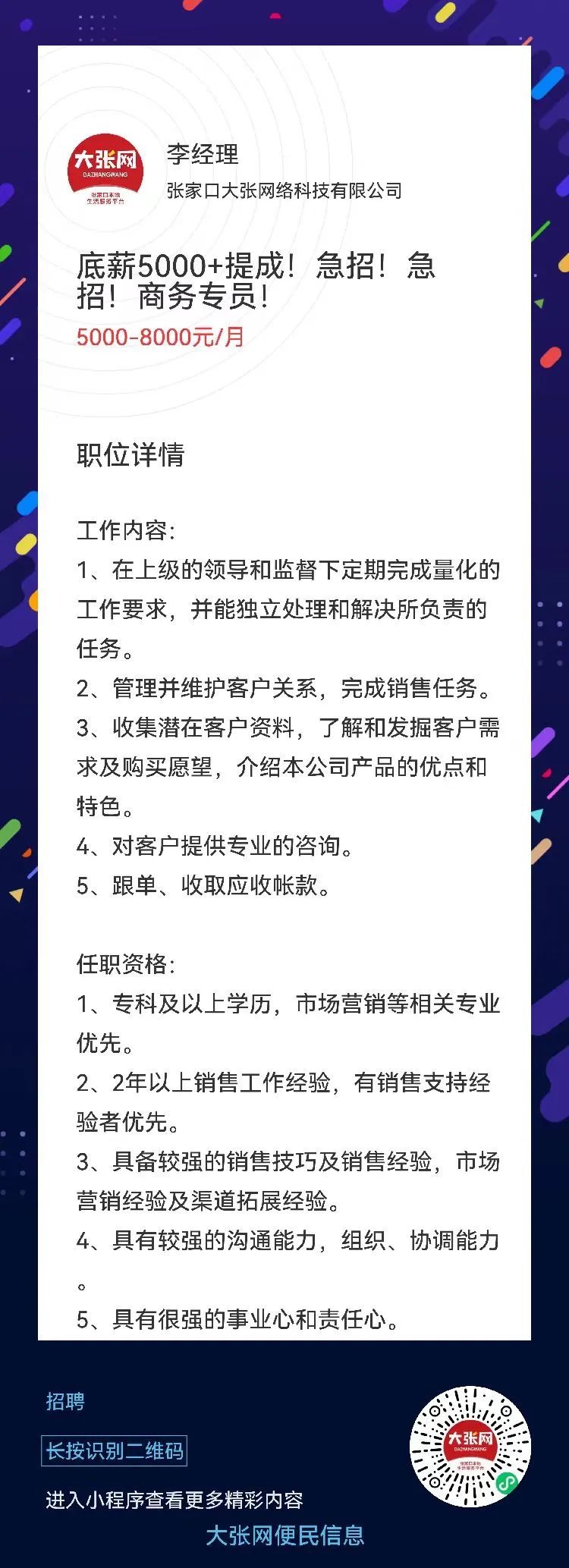 张家口人都在这里发布便民信息:急招底薪5000+提成商务专员、学校内健身房转让、长期招全职兼职存钱罐工..