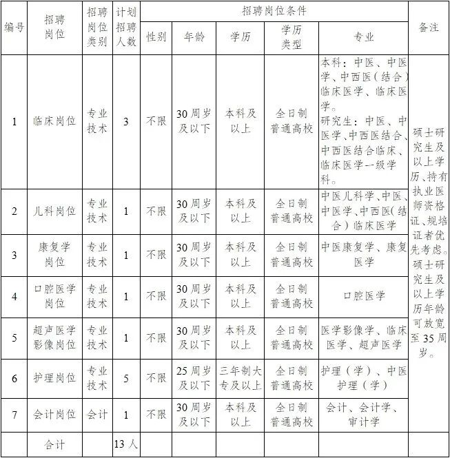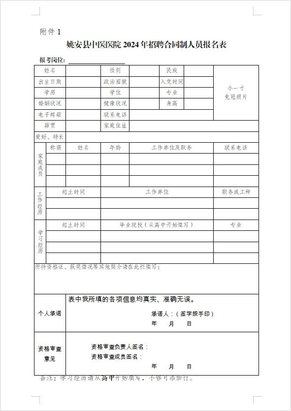 根据医院需要,经报请主管部门批复同意,拟公开招聘合同制人员13人。 一、招聘原则 坚持党管人才原则,坚持德才兼备原则,民主、公开、竞争、择优,实行公开招聘,在考试、考核的基础上择优聘用。 二、招聘条件、岗位及专业要求 (一)报名基本条件 1. 具有中华人民共和国国籍,拥护中国共产党的领导和党的路线、方针、政策。 2. 遵守中华人民共和国宪法和法律,品行端正,具有良好的职业道德。 3. 身体健康,具备履行岗位职责要求的身体条件。 4. 具备吃苦耐劳、乐于奉献的品质,有高度事业心、责任感和一定的专业技术水平。 5. 年龄认定:25周岁及以下指1999年5月20日(含5月20日)以后出生人员;30周岁及以下指1994年5月20日(含5月20日)以后出生人员;35周岁及以下指1989年5月20日(含5月20日)以后出生人员。 6. 符合招聘公告规定的具体岗位条件,一人限报一个岗位。 7. 2024年以前毕业的护理岗位报名人员需持护士资格证或护士执业资格考试成绩合格证明。 8.专业认定。专业主要参照教育部发布的《高等职业教育专科新旧专业对照表》《高等职业教育本科新旧专业对照表》《普通高等学校本科专业目录》《研究生学位授予和人才培养学科目录》设置。限制到具体专业的岗位仅专业符合的方可报考。 (二)不符合报名条件的情形 1. 受过党纪、行政处分尚未解除或在校期间受过警告及以上处分未解除的; 2. 曾受过刑事处罚或有违法违纪嫌疑正在接受调查审查的; 3. 报名时提供虚假证件或信息的; 4. 不符合考聘岗位要求有关条件的; 5. 住院医师规培期间未取得培训合格证的人员,在培的非2024年7月结业的住院医师规范化培训学员; 6. 吸毒人员(含吸毒史)和被依法列为失信联合惩戒对象的人员; 7. 曾被机关事业单位开除公职5年以内的; 8. 法律法规规定不得聘用的其他情形。 (三)岗位人数和专业要求 三、招聘程序和方法 本次招聘工作由姚安县中医医院负责,按照发布招聘公告、报名、资格审查、笔试、面试、拟录用人员公示、体检、政审、录用等步骤实施。 (一)发布公告 本次公开招聘合同制人员信息在姚安县中医医院微信公众号、医院官方网站上进行发布,发布时间为2024年5月19日。 (二)报名 1. 报名时间:2024年5月20日至2024年5月24日17:00止。报名联系电话:蔡老师0878-5712600;18787824205。 2. 报名方式:采取到医院人事科报名或邮箱投递报名任意一种方式。 (1)到医院人事科报名:姚安县中医医院门诊医技楼8楼人事科。 (2)邮箱投递报名:报名人员相关资料请在报名时限内发至姚安县中医医院人事科邮箱(yaxzyyyrs@163.com)。 3. 报名时须提供如下资料: (1)填写的《姚安县中医医院2024年招聘合同制人员报名表》(附后)、小一寸证件免冠照1张。 (2)有效身份证件或户口簿原件及复印件(要求身份证正反两面、或户主面本人面复印在一页上)。 (3)普通高中毕业证或毕业证证明原件及复印件。 (4)往届生提供最高学历毕业证、学位证,同时提交学信网有效期内的教育部学历证书电子注册备案表和教育部学籍在线验证报告。 (5)2024年应届生提供就业推荐表原件及复印件。同时提交学信网有效期内的教育部学籍在线验证报告。并在2024年7月31日前提供岗位所需的毕业证书、学位证。 (6)本专业资格证书原件及复印件(已取得的提交),2024年以前毕业的护理岗位报名人员需提供护士资格证或护士执业资格考试成绩合格证明。 (7)个人简历、应聘岗位所需要的相关材料、获奖证书等。 (8)邮箱投递线上报名材料要求提供以上材料原件扫描件,报名表为手写签字按手印后的扫描件。所有资料按以上所列顺序规范整理并统一上传一个PDF文件,规范命名为“姓名-应聘**岗位”(如:李**-应聘姚安县中医医院**岗位),否则视为无效报名。 资料不齐全的资格审核不通过。 4. 报名注意事项:考生需注意报名起止时间,在此时间段之外的报名一律无效。每个应聘者只能选择报考一个岗位,不得重复应聘。考生所填信息、所留联系电话号码必须真实准确无误,若所填信息错误或所留号码错误,导致资格审核不合格或无法与本人取得联系的,后果由考生自行承担;若提供虚假材料,弄虚作假、隐瞒真实情况不符合报名资格的一律取消报名资格,一切后果由本人负责。 (三)资格审查 医院对应聘人员提交的相关材料进行资格审查,经审查符合报名条件者,接受其报名申请,资格审查贯穿招聘工作全过程,对不符合报名条件、弄虚作假或违反招聘规定的,取消其应聘或聘用资格。资格审查结果将以电话通知方式告知本人。 (四)考试方法及有关要求 1. 考试考核采用笔试和面试相结合的方式进行,笔试和面试成绩总分均为100分。 具备以下条件之一的,可免笔试,直接进入面试,面试成绩即为综合成绩: (1)具有硕士研究生及以上学历人员; (2)持有执业医师资格证人员; (3)持有规培证人员。 2. 报名人数减去免笔试人数与招聘人数小于或等于3:1的岗位可直接进入面试,以面试成绩作为应聘人员综合成绩。 若报名人数减去免笔试人数与招聘人数超过3:1的岗位采用专业测试(笔试)和面试两个程序进行。进入面试环节人数按该岗位专业测试成绩排名,以岗位招聘人数的3倍确定进入面试人员(若岗位招聘人数3倍的最后一名笔试成绩并列的,一并进入面试),应聘人员综合成绩=专业测试(笔试)成绩×50%+面试成绩×50%。在计算成绩时,专业测试(