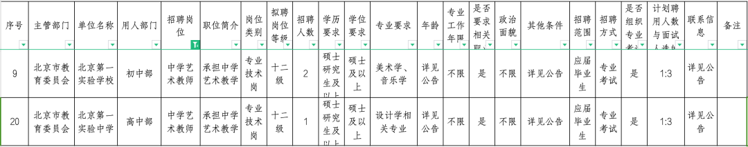 北京第一实验学校、北京第一实验中学 依据《北京市事业单位公开招聘工作人员实施办法》(京人社专技发〔2010〕102号)文件精神,结合北京第一实验学校、北京第一实验中学办学需求,2024年北京第一实验学校、北京第一实验中学拟面向社会进行公开招聘。具体招聘要求及程序说明如下: 一、招聘单位及岗位 北京第一实验学校、北京第一实验中学在编教师,岗位信息见附件1。 (学前教育教师招聘主体为北京第一实验学校幼儿园,该园隶属于北京市通州区教育委员会。公开招聘结束后,所有学前教育教师编制关系将由北京市通州区教育委员会接收。) ![]() 二、招聘对象 限列入国家统一招生计划(不含定向、委培)的普通高等院校2024年应届毕业生; 2022年、2023年离校未落实工作单位,其户口、档案、组织关系仍保留在原毕业学校,或保留在各级毕业生就业主管部门(毕业生就业指导服务中心)、各级人才交流服务机构和各级公共就业服务机构,择业期内未缴纳社会保险的普通高等院校毕业生; 2023年9月1日至报名截止时取得国(境)外学位并完成教育部学历认证,符合报考职位条件、未落实工作单位的留学回国人员。 三、招聘条件 (一)具有中华人民共和国国籍,坚持中国共产党的领导,遵纪守法,品行端正,热爱教育事业,遵守教师职业道德,恪守工作纪律。 (二)身心健康,能胜任岗位工作要求。 (三)报考人员需岗位要求的相应学历。 (四)应届毕业生在35周岁及以下(即1989年1月1日之后出生)。非北京生源应届毕业生相关条件均须符合2024年北京市关于非北京生源毕业生引进的各项要求;硕士研究生限30周岁及以下(即1994年1月1日之后出生),博士研究生限35周岁及以下(即1989年1月1日之后出生)。 毕业生在校期间所修科目成绩全部合格,毕业时如期取得相应的学历、学位证书;所学专业与岗位要求条件相符。 (五)符合招聘岗位所需的其他条件。 四、招聘安排 (一)报名 2024年5月23日9:00至2024年5月24日17:00。 具备资格条件的报考人员通过问卷链接 (https://www.wjx.cn/vm/mrTZVJL.aspx#)报名,每名报考人员限报一个岗位,报名时所填个人信息必须真实有效,学历、专业等信息与岗位需求必须相符,报名与考试时使用的身份证件需一致,否则取消本次公招报考资格。 应届毕业生报名时需上传以下相关附件: 1.毕业生就业主管部门盖章的毕业生就业推荐表、统招证明(就业推荐表上注明“统招”的,无须开具统招证明);择业期内的毕业生,还须提交存档单位证明信及社保权益记录单(加盖存档单位公章); 2.教育部学籍在线验证报告(本科至最高学历); 3.岗位要求的英语等级证书或符合要求的英语成绩单,若岗位没有要求,可不提供相应的等级证书或成绩单; 4.最高学历校级教务主管部门盖章的已修全部课程成绩单电子照片; 5.已取得教师资格证书的提交教师资格证书电子照片;取得有效期内《中小学教师资格考试合格证明》的提交教师资格考试合格证明网上查询截图(有效期内教师资格笔试及面试各科考试均合格的视为具有教师资格,仅笔试合格的不视为具有教师资格)。 6.已取得的学历学位证书(本科至最高学历); 7.身份证正、反面复印在一页纸上的电子照片; 8.户口簿首页和本人页复印在一页纸上的电子照片;若户口在集体户,提交本人页电子照片及集体户首页复印件并加盖户籍管理部门公章的电子照片,或集体户籍管理部门出具并盖章的户口证明的电子照片(写明“姓名、身份证号、户籍在XX集体户”即可); 9.岗位要求所需资格条件的其他材料。 留学生报名时需上传以下相关附件: 1.已取得的学历学位证书(本科至最高学历),如有国内高等教育学历,还需提供教育部学籍在线验证报告; 2.教育部学历认证证书; 3.出入境记录(国家移民管理局出具); 4.外语成绩单; 5.已取得教师资格证书的提交教师资格证书电子照片;取得有效期内《中小学教师资格考试合格证明》的提交教师资格考试合格证明网上查询截图(有效期内教师资格笔试及面试各科考试均合格的视为具有教师资格,仅笔试合格的不视为具有教师资格); 6.身份证正、反面复印在一页纸上的电子照片; 7.户口簿首页和本人页复印在一页纸上的电子照片;若户口在集体户,提交本人页电子照片及集体户首页复印件并加盖户籍管理部门公章的电子照片,或集体户籍管理部门出具并盖章的户口证明的电子照片(写明“姓名、身份证号、户籍在XX集体户”即可); 8.岗位要求所需资格条件的其他材料。 报考人员可在附件查询岗位所要求的专业、学历、学位、资格条件等信息,若有疑问,请报考人员与学校人事部门联系 (联系电话:010—89595265— (转8015); 咨询时间为工作日上午8:00-12:00,下午13:30-17:30)。 (三)资格审核 投递简历人员应保证上传材料的真实性,学校人事部门将依据招聘条件对报名应聘者进行资格审核,对资格初审合格者邮件通知进入笔试环节。资格审核工作贯穿招聘全过程,发现不合格者,立即取消应聘资格。 (四)笔试 通过资格审核者按照邮件通知参加考试。 笔试成绩满分为100分,合格成绩为60分,达到或超过合格成绩的人员按照1:3进入面试环节。 (五)面试 专业素养与综合能力面试考核。 按照笔试成绩与面试成绩50%、50%的权重计算综合成绩,依据综合成绩,原则上按1:1的比例确定考察人选。 (六)体检、考察 面试结束后,根据考生综合成绩确定参加体