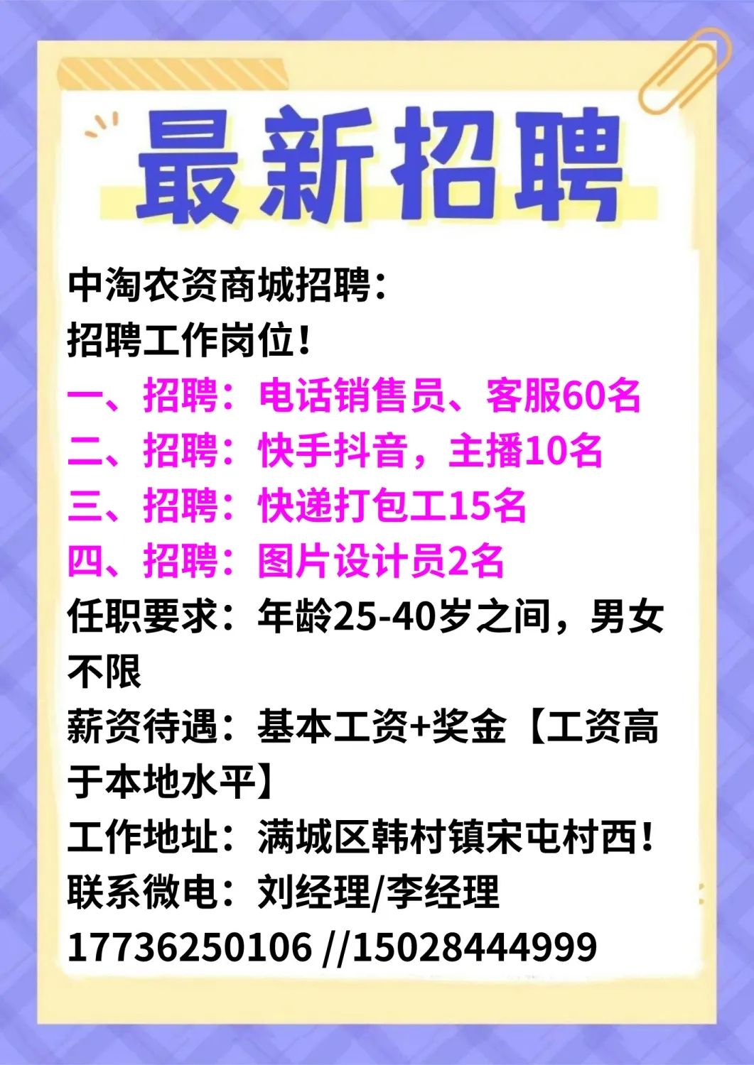 关注我们,每天7:00准时更新最新信息! 🔥置顶急聘 ![]() 【招聘】 岗位详情:中淘农资商城招聘: 岗位福利:[环境好] 工作地址:保定市满城区韩村镇宋屯村西 联系电话:15028444999