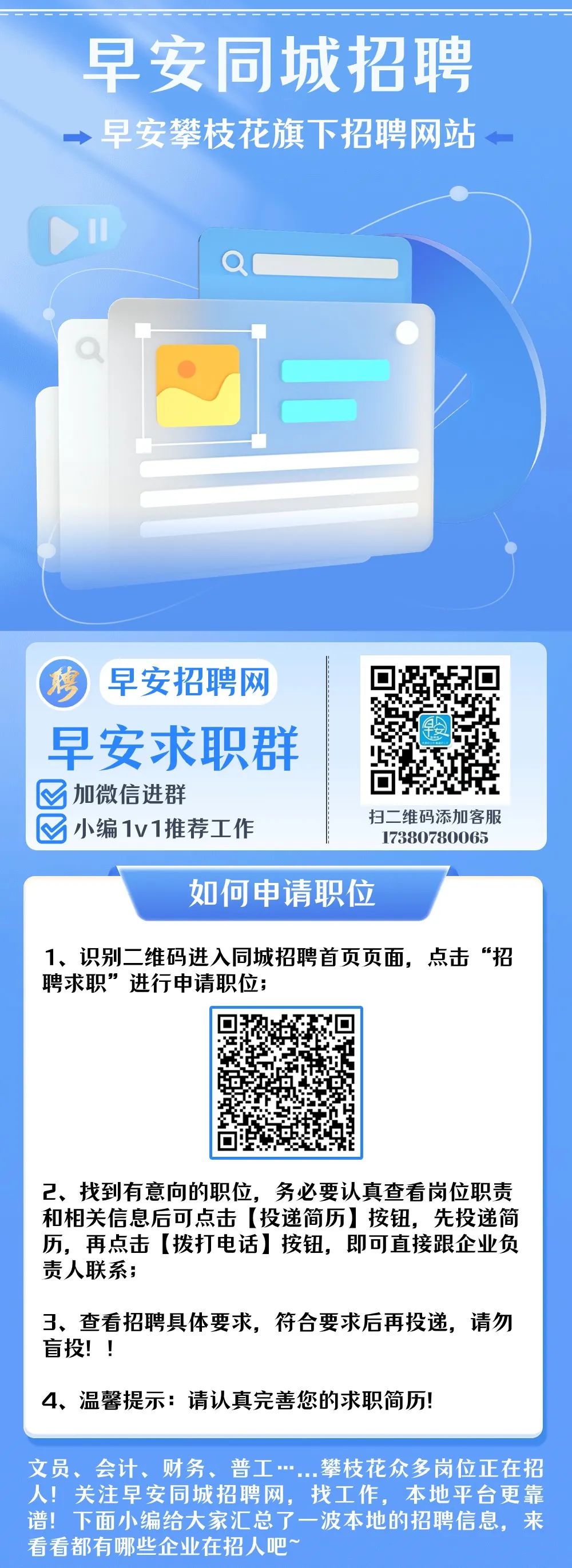 客服 面议 职位描述 物流公司客服,主要接电话,打单,调配送货。能吃苦,有责任心,有工作经验者优先。 上班时间早上6.30到中午12点。 送货司机 4000-5000元/月 职位描述 对工作认真负责,服从安排,学习力强 业务员 5000-8000元/月 职位描述 负责产品销售,客户的开发与维护,能吃苦耐劳 熟练驾驶面包车 招聘职位 : 电子商务平台后勤人员 薪资待遇 : 4000-5000元 招聘人数 : 3人 · ENJOY· 📝 编辑 | 希希 审核 | 勇哥 本平台部分招聘信息来源于网络,如有侵权请联系删除 部分信息为企业独家授权发布,未经允许严禁转 |