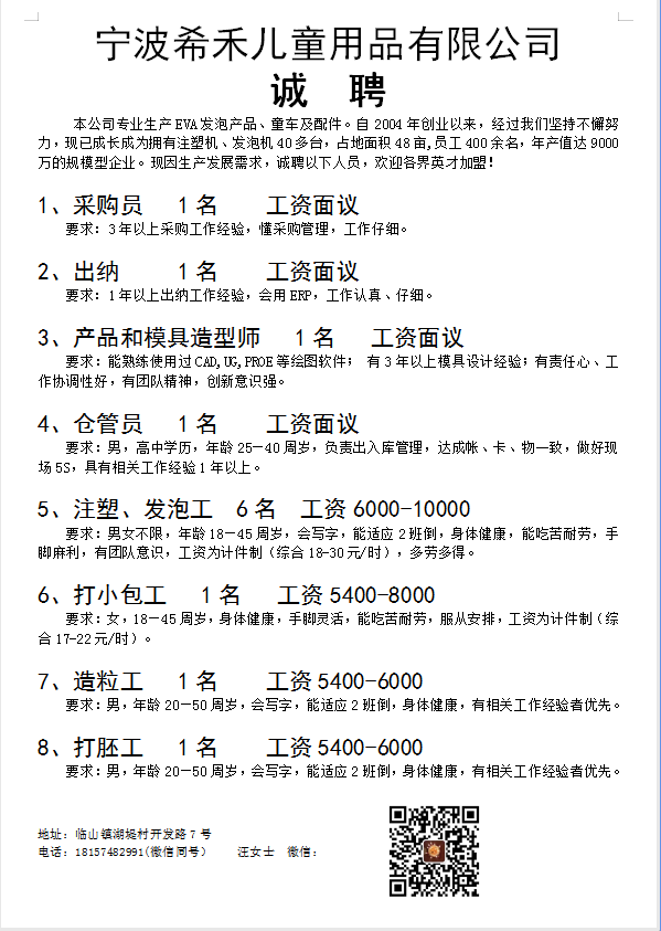 衷心感谢您一直以来对我公司的关注与支持!前行人才搬迁至新营业厅办公,我们将更加努力为您提供更专业、更优质的服务,欢迎大家光临! 咨询电话:0574-62125968 新营业厅地址: 地址:余姚泗门光明北路201-63号(悦滨湾商铺前行人才营业厅) 咨询电话:0574-62125968 余姚市卡普汽车用品有限公司 生产管理 品质检验 仓管员 产品工程师 装配焊锡普工多名 地址:余姚市谭家岭西路1279号龙邦4楼 电话:18267475052 (无人接听或占线时,加微信rcsc111) 泗门四职校 语文代课老师 数学代课老师 没有资格证也可以,具体面议 地址:泗门 联系电话:18094540335 (无人接听或占线时,请加微信手机同号) 诚聘 冲床工 地址:余姚老方桥 电话:18094540335 (无人接听或占线时,请加微信手机同号) 余姚金型路 操机编程 俩台机,长白班,工资10000加,具体面议 电话:18094540335 (无人接听或占线时,请加微信手机同号) 诚聘 C1驾驶员 年龄30-45岁,需要吃苦耐劳,试用期工资6500+500全勤,有工作餐,具体面议。 地址:泗门镇谢家路村 电话:13685860203 余姚市悦利电器有限公司 胶木注塑工5-6名 模具设计 模具半熟练工 余姚市低塘街道新洋路55号 电话:18267475052 (无人接听或占线时,加微信rcsc111) 伟琪模具厂 cnc操机师傅1名,薪资10000-11000 地址:余姚市模具城金盛一路136-1号 电话:18267475052 (无人接听或占线时,加微信rcsc111) 余姚汇博精密机械有限公司 走心机师傅1名 地址:余姚梁辉开发区来雁路3号门卫 电话:18267475052 (无人接听或占线时,加微信rcsc111) 余姚市力顿塑料制品厂 注塑吹瓶师傅 业务跟单 地址:临山 电话:18094540335 (无人接听或占线时,请加微信手机同号) 诚聘 注塑带班 地址:余姚方桥 电话:18094540335 (无人接听或占线时,请加微信手机同号) 黄家埠高桥招聘 冲床工,20块一小时,一天9.5个小时,7:30-11:30,12:30-1800,夏冬季时间略微调整,不包住,饭补15块一天,加班按时计算,休息看活安排,一个月不少于26天班 电话:18094540335 (无人接听或占线时,请加微信手机同号) 诚聘 精雕操机工1名,30元/时左右,有社保,单休,提供中餐,假期休息工资照发,按8小时算,具体面议 地址:梁辉开发西区腾蛟路 电话:18267475052 (无人接听或占线时,加微信rcsc111) 宁波鹏翀包装材料有限公司 淘宝客服 要求:女性,年龄25-35周岁,高中以上文化水平,打字快,学习接受能力强。工作时间:周一至周六,早上8:30-17:00,周日休息,有法定节假日,交社保,年终奖和餐补,过年带薪放假。(待遇具体面谈)。家住周巷,朗霞,低塘,有工作经验的优先考虑。 工作地点:朗霞万洋创业园区( 朗霞街道新新路288号)有意向的联系 电话:13884434309 (无人接听或占线时,加微信rcsc111) 诚招 气泵车202外圈后道熟练工1名 地址:横河相士地村 电话:18042053150 宁波市颜宸电子商务有限公司 仓管质检员 拆包员 地址:余姚市长新路49号 电话:13857499458 (无人接听或占线时,加微信rcsc111) 凯波集团 注塑带班 外贸业务员 地址:周巷 电话:18094540335 (无人接听或占线时,请加微信手机同号) 余姚市熠明塑料制品有限公司 注塑工 地址:临山临海 电话:18094540335 (无人接听或占线时,请加微信手机同号) 宁波金涛电子有限公司 车间记账员,要求本地人 地址:泗门楝树下 电话:18094540335 (无人接听或占线时,请加微信手机同号) 宁波库帕玛电器科技有限公司 内销业务员 外贸业务员 跟单人员 地址:泗门光明北路15号 电话:18094540335 (无人接听或占线时,请加微信手机同号) 诚聘 瓶盖压盖机机修学徒 20一35岁,有电工基础优先,工资6000以上,包吃包住,试用期一个月,具体面议 地址:小曹娥 电话:18094540335 (无人接听或占线时,请加微信手机同号) 宁波江北友联金属制品有限公司 机修师傅,学徒 业务员 B2照驾驶员 公司提供住宿,具体面议 地址:宁波江北区东保线附近 电话:18267475052 (无人接听或占线时,加微信rcsc111) 诚聘 淘宝客服6名 工作轻松简单,年龄20-30岁,打字快,爱聊天优先考虑,无责底薪4000+绩效提成+奖励 都是年轻人90后00后,工作氛围好,不定时下午茶,单休 非诚勿扰 地址:中昂·江澜府,泗门四海大道与河塍路交叉口泗门全民健身中心旁(泗门镇商会大厦旁) 电话:18267475052 (无人接听或占线时,加微信rcsc111) 元瑜伽诚聘: 一、销售专员10名,薪资10000-15000/月,1.配合销售团队完成公司开业预售销售目标和年度销售目标;2.较强的沟通能力和协调能力,有效与客户和团队成员有效互动;3.快速学习新产品或服务的知识,并善于总结经验;4.对销售工作有强烈的兴趣和自信心,渴望实现自我价值,能够承受工作压力。 二、瑜伽老师5名,10000-15000/月,1.有一定瑜伽相关的工作年限;2.有较强沟通能力和学习能力;3.有团队协作意识;4.对瑜伽老师工作有热情,且有抗压能力,具体面议。地址:余姚市兰墅路175号星和空间设计 电话:18267475052 (无人接听或占线时,加微信rcsc111) 诚聘 电商客服若干名 高中及以上学历,年龄25-40岁,双休,薪资面议 地址:慈溪市新城大道北路2018西北方向60米(慈溪多方达大厦) 电话:18267475052 (无人接听或占线时,加微信rcsc111) 招聘、招聘、招聘 招美容师、学徒若干名 保底3000,每月4天带薪休假 认真干5000以上, 努力干8000以上, 拼命干15000以上 混日子的请绕道。 工作地点:浙江慈溪匡堰镇社坛路20号(良咔瘦身) 电话:17379356488 微信:17379356488 余姚三众塑料制品有限公司 品质员 检验员 地址:泗门四海大道100号 电话:18094540335 (无人接听或占线时,请加微信