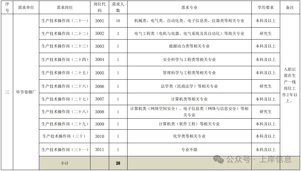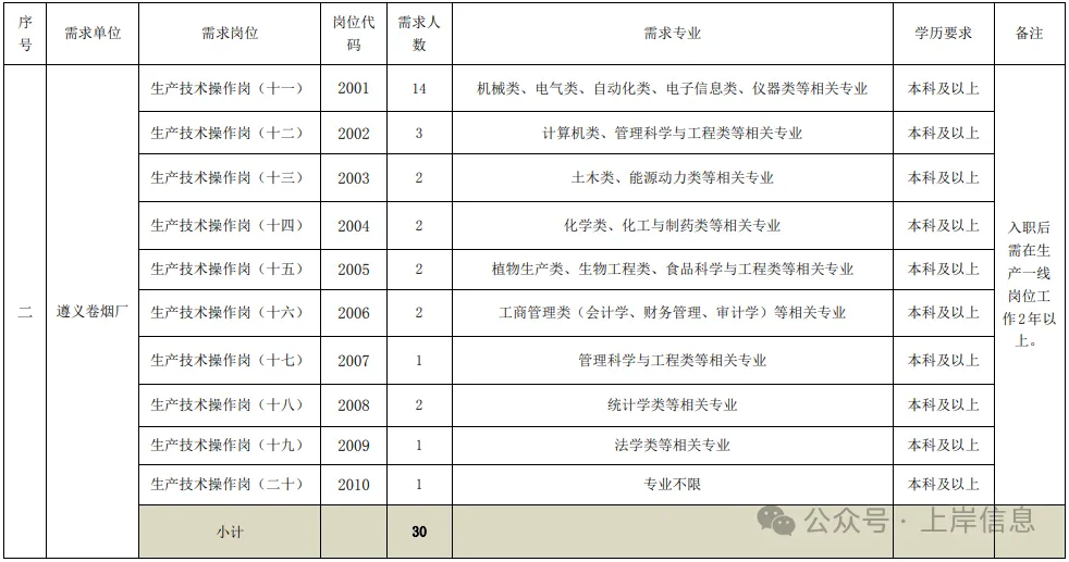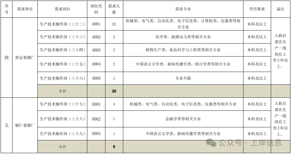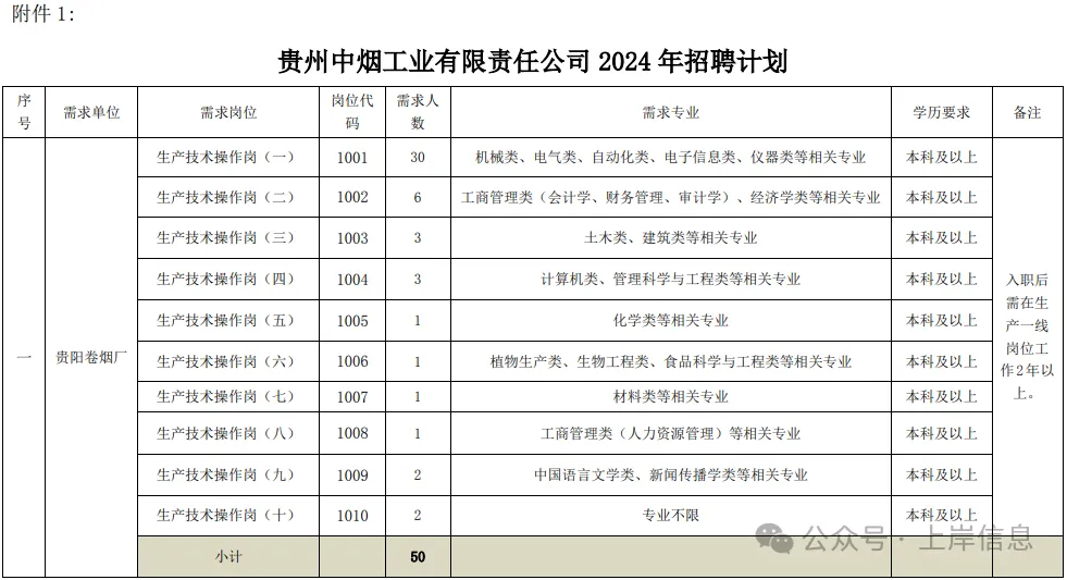 二、招聘对象 1.2024年全国普通高等院校统分统招应届毕业生; 2.国(境)外留学生须为2023年9月1日-2024年8月31日毕业并取得国(境)外学位、完成教育部门学历认证后初次就业的留学回国人员。 三、报考条件 1.具有中华人民共和国国籍; 2.拥护中华人民共和国宪法,拥护中国共产党领导和社会主义制度; 3.具有良好的政治素质和道德品行,遵纪守法,无违法违纪及不良行为记录; 4.符合岗位专业、学历及相关条件要求; 5.具有正常履行岗位职责的身体条件和心理素质,报考卷烟厂职位应无影响生产设备安全操作的身体功能缺失,能胜任夜班工作和长时间站立工作; 6.应聘者须于2024年8月31日前取得毕业证、学位证。 四、不得报考的情形 凡有下列情形之一的,不得报名: 1.受过刑事处罚、被开除党籍或被依法列为失信联合惩戒对象的人员; 2.在接受高等教育期间受到院系级(含)以上单位处分且还在影响期内的人员; 3.涉嫌违纪违法正在接受有关专门机关审查尚未作出结论的; 4.在国家法定考试、各级公务员及企事业单位招录考试中有舞弊等严重违反招录纪律行为的; 5.以往招聘中有诚信问题者; 6.具有法律法规规定不得录用为国有企业工作人员的其他情形; 7.违反烟草行业招聘工作回避制度规定的。 五、招聘程序 招聘程序包括报名、在线测评、网上资格审查及简历筛选、笔试、面试、考察与体检、公示及录用等环节。 (一)报名 1.报名时间:2024年5月14日12:00—2024年5月22日12:00。 ▼点下方名片回复 “贵州中烟”查看岗位 2.报名方式:本次招聘采取网上报名,报名人员请登录网址(http://gzzy2024.zhaopin.com/)填报相关信息进行网上报名。 3.报名注意事项 (1)报名人员在报名时,须认真阅读《承诺书》,提交个人资料时勾选相关选项进行确认并在应聘过程中严格遵守,自愿承担提交不实信息导致的一切后果。 (2)报名人员应符合报考岗位条件要求,只能选择一个单位的一个岗位报名。 (3)报名人员所填内容和提交材料务必真实、准确、完整。 (4)报名人员报名与考试时使用的身份证必须一致。 (5)报名人员须按照招聘条件要求一一对应填写,专业名称须与本人毕业证一致。未按要求填写,因错、漏、改、增字造成审核不合格的,由报名人员自行承担取消应聘资格的后果。 (6)报名人员须将本人近期免冠1寸证件照、毕业证或学信网电子注册备案表(未毕业上传学信网学籍在线验证报告)、学位证等相关证书上传至招聘系统,提交材料应当真实、准确。 (7)报名人员对招聘岗位的专业、学历以及其他条件等有疑问的,请拨打咨询电话。 (二)在线测评 报名人员在报名后即可收到测评邮件,请报名人员按邮件通知要求进行测评,在线测评完成时间截止于2024年5月23日17:00。报名人员未遵照邮件通知进行测评的视同放弃,在线测评只有一次机会,请务必认真作答。逾期未作答、在线测评结果无效者,视为网上报名不成功。 (三)网上资格审查及简历筛选 1.根据应聘者报名信息,对照招聘条件进行网上资格初审。 2.根据招聘岗位要求进行简历筛选,各岗位按招聘计划的1:10确定参加笔试人员。 3.在线测评结果有效、资格初审合格,经简历筛选通过的人员方可参加笔试,具体入围名单将以电子邮件、短信或电话的方式通知本人,未入围者不再另行通知。 (四)笔试、面试 考试采取先笔试后面试的方式进行。 1.笔试:笔试拟于6月份在贵阳市进行,采用线下机考方式。笔试内容为“行政职业能力测验”(占70%)和“综合基础知识”(占30%),闭卷考试,考试时长120分钟,笔试满分为100分。笔试有关事项以电子邮件、短信或电话方式通知参加笔试人员。 当某岗位笔试实际考试人数低于招聘计划3倍时,视情况核减或者取消该岗位的招聘计划。 笔试人员现场提交自己签名的纸质《承诺书》后方可参加笔试;笔试成绩以短信或电子邮件通知应聘人员。 2.面试:根据笔试成绩,各岗位按招聘计划的1:3从高分到低分确定面试人员,入围面试人员最低笔试分数如出现同分者,均进入面试。面试满分为100分,低于60分者不予录用。面试有关事项以电子邮件、短信或电话方式通知参加面试人员。 面试成绩以短信或电子邮件通知应聘人员。 (五)考察与体检 根据综合成绩(笔试分×40%+面试分×60%),各岗位按招聘计划的1:1从高分到低分确定考察与体检人选,综合成绩相同的,面试成绩高的优先。考察与体检人员名单在贵州中烟官网公布。考察与体检工作拟于7月份进行。 1.资格复审。考察与体检前,由考生所报考单位开展资格复审,主要核实应聘者是否符合招聘资格条件。应聘者须提供身份证、毕业证、学位证原件。资格复审时暂未取得相关材料的,被审查人员提供有关证明材料并作出书面承诺后,可先进行考察与体检。未通过资格复审的,取消考察与体检资格。 2.考察。重点了解应聘者的思想政治表现、道德品行、遵纪守法以及是否需要回避等方面的情况。考察人选按照要求,向报考单位提供学校开具的政审证明材料。 3.体检。体检标准参照公务员录用体检标准有关规定执行,在指定医疗机构进行。应聘者对体检结果有疑问的,可以按照规定提出复检。体检结果以复检结论为准。体检不合格的,不得确定为拟录用人员。 (六)公示及录取 通过考察与体检的,确定为拟录用人员,在中国烟草人才招聘平台和贵州中烟官网进行公示。公示结果不