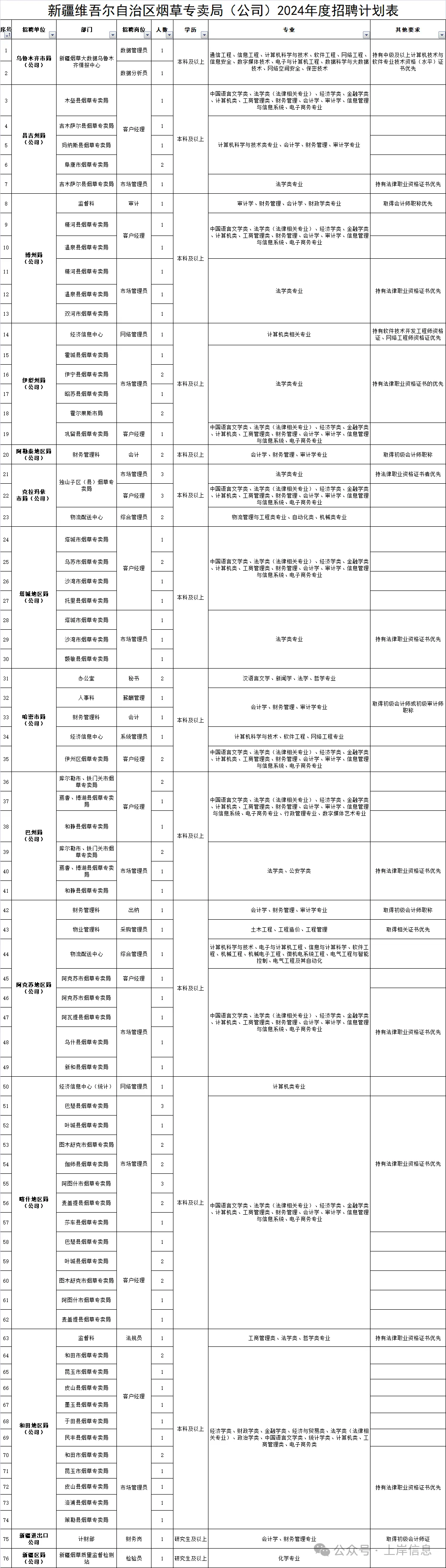 点击上方蓝字关注我们 新疆维吾尔自治区烟草专卖局(公司)2024年应届高校毕业生招聘公告 新疆维吾尔自治区烟草专卖局(公司)组建于1986年,下辖15个地市级烟草专卖局、13个地市级烟草公司及1个进出口公司。根据工作需要,拟公开招聘工作人员。本次招聘工作委托第三方机构进行,现将有关事项公告如下: 一、招聘对象 (一)2024年全国普通高等院校统分统招应届毕业生,须于2024年7月31日前取得国家认可的大学本科及以上学历,并取得相应的学位证书,且未落实就业单位。 (二)2023年1月1日至2024年7月31日期间,取得国(境)外院校大学本科及以上学历和相应学位的毕业生,须于2024年7月31日前取得中国教育部留学服务中心学历学位认证,且未落实就业单位。 二、招聘岗位 本次招聘岗位计划、专业及资格要求,具体详见《新疆维吾尔自治区烟草专卖局(公司)2024年度招聘计划表》(附件1)。