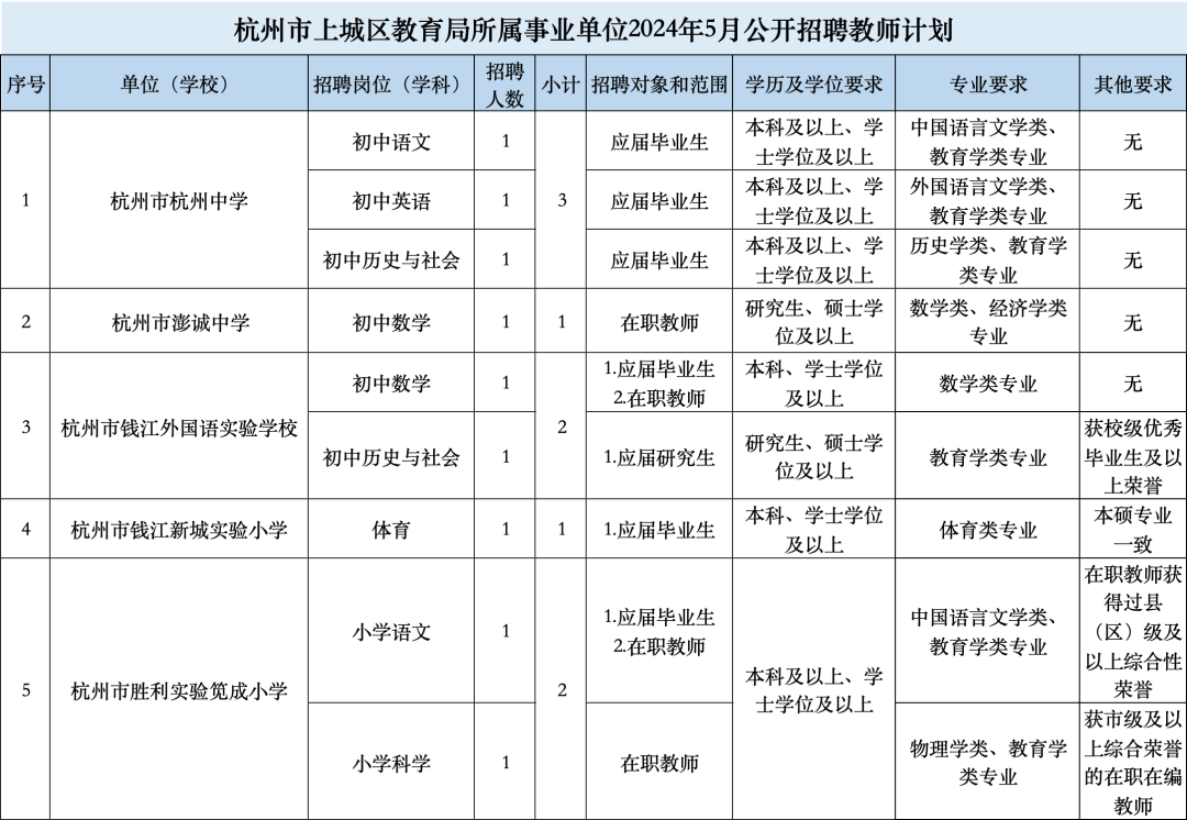 参加本次招聘的事业单位,经费形式均为财政全额拨款,参加本次招聘被聘用的人员均列入事业编制。各招聘单位、岗位、人数、条件及其他情况详见附件1《杭州市上城区教育局所属事业单位2024年5月公开招聘教师计划》(以下简称“计划”)。