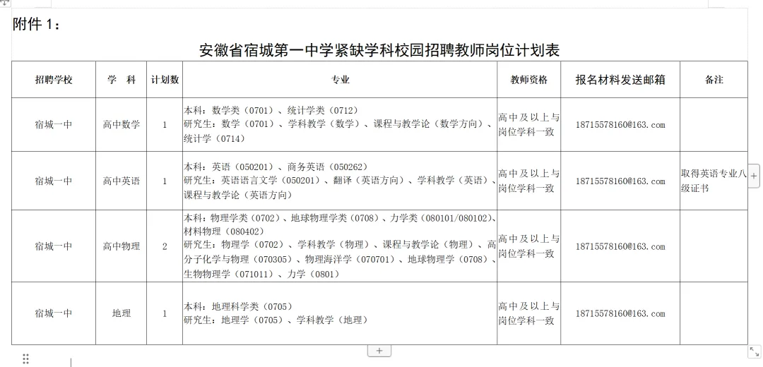 为做好宿州市安徽省宿城第一中学校园招聘教师工作,根据《安徽省教育厅 安徽省人力资源和社会保障厅 安徽省机构编制委员会办公室 安徽省财政厅关于进一步改进和完善中小学新任教师公开招聘工作通知》(皖教〔2019〕29号)、《安徽省教育厅 中共安徽省委机构编制委员会办公室 安徽省财政厅 安徽省人力资源和社会保障厅关于进一步完善中小学教师招聘制度落实市县中小学教师招聘主体责任的通知》(皖教秘师〔2020〕90号)文件精神,现将有关事项公告如下: 宿州市位于安徽省东北部,地处苏鲁豫皖四省交汇地带,是安徽省的北大门,临江近海。境内铁路、公路交织,交通便捷,乘坐高铁1小时可到达南京、合肥,2小时可到达上海,3小时可到达北京。 宿城一中创建于1906年,安徽省首批示范高中。有2个校区。校本部位于宿州市政务新区,占地300余亩;宿马校区位于宿马产业园,占地200亩。现有147个教学班(其中宿马校区30个班),现有在职教师470人。45岁以下教师占比65.8%,高级教师150人,特级教师3人,正高级教师1人;中高级以上教师占比85.9%。 北京师范大学、华东师范大学、华中师范大学、西南大学、东北师范大学、陕西师范大学、南京师范大学2024届本科及以上学历且取得相应学位的毕业生。 宿城一中本轮计划招聘教师5名,其中:数学1人、英语1人、物理2人、地理1人。具体岗位及专业要求见附件1。