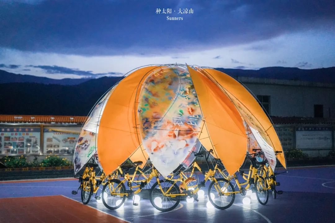 在孩子们的眼睛里,有房屋、果树、山水与星空。自行车的挡泥板与瓦楞纸,被他们做成一只只可以挂在树枝上的“大眼睛”,再用镂空与浮雕绘制出自己眼中的风景;你或许还会见证二手共享单车的零件是如何被孩子们一点一点绘上颜色、插上羽翅,变身成为一座梦幻的旋转木马,感受到他们无与伦比的执行力与创造力。