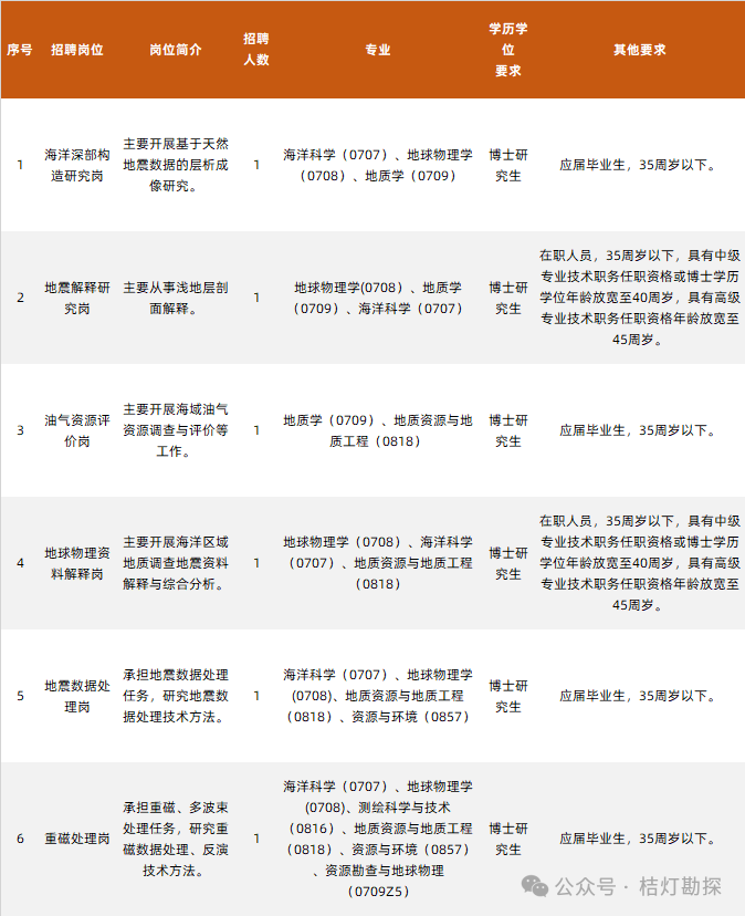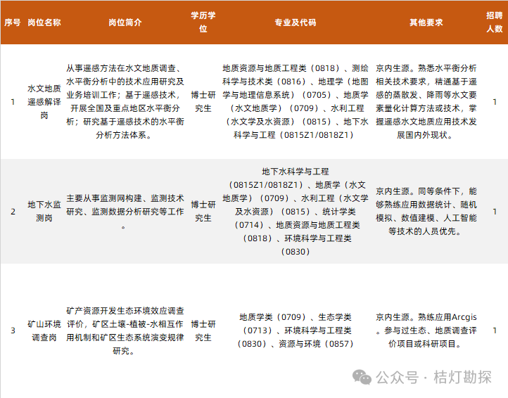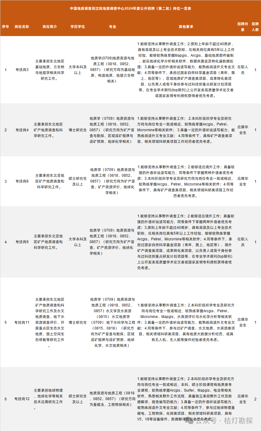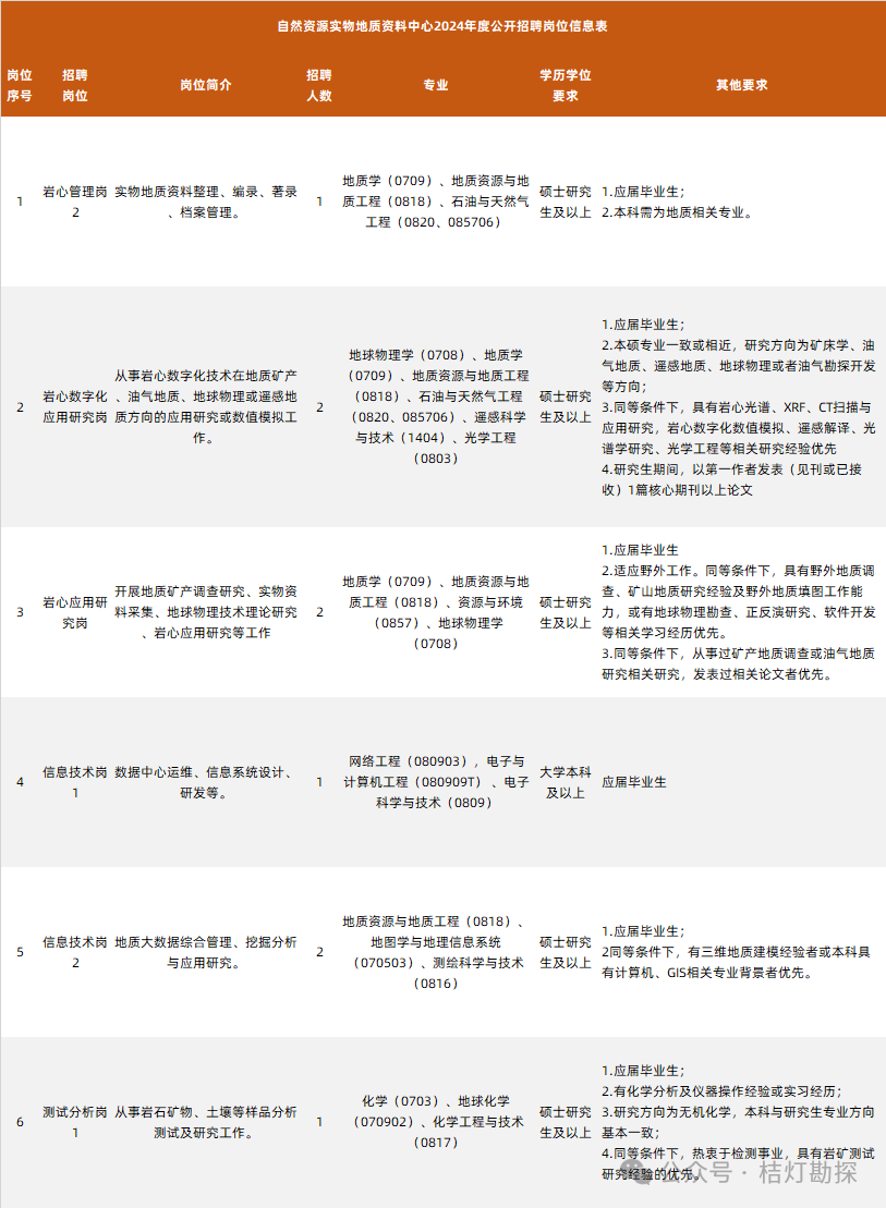 近期,中国地质调查局所属4家单位发布2024年度公开招聘工作人员通知,分别为:青岛海洋地质研究所 中国地质调查局沈阳地质调查中心(东北地质科技创新中心)中国地质环境监测院(自然资源部地质灾害技术指导中心)自然资源实物地质资料中心 青岛海洋地质研究所![]() 报名时间: 公告发布之日至2024年5月31日。 中国地质调查局沈阳地质调查中心(东北地质科技创新中心)![]() 报名时间:公告发布之日起至2024年6月6日。 中国地质环境监测院(自然资源部地质灾害技术指导中心)中国地质环境监测院(自然资源部地质灾害技术指导中心)是中国地质调查局直属的正局级公益一类事业单位,主要承担水文地质与水资源调查监测、地质灾害调查监测与防治、自然资源综合调查、资源环境承载能力与国土空间开发适宜性评价,承担国土空间生态修复技术支撑,向社会提供公益性服务。 <点击图片查看高清大图> ![]() 报名时间: 公告发布之日起至2024年5月27日。 <点击图片查看高清大图> ![]() 报名时间:公告发布之日起至2024年5月30日。 -----END----- 社群交流 / 原创投稿 / 商务合作 (请添加下方小助手微信) 来源:桔灯勘探