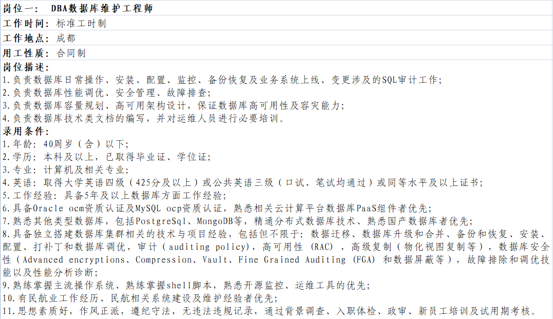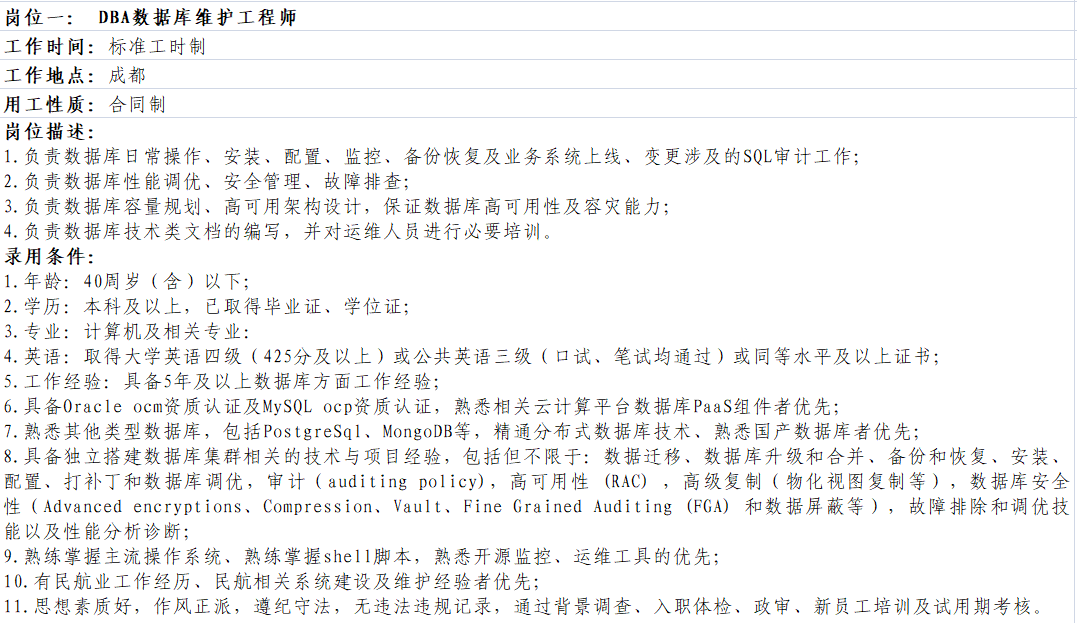 四川航空股份有限公司(以下简称:川航)以安全为品牌核心价值,自开航至今持续安全飞行35年,现运营全空客机队近200架飞机,年运送旅客量超过3000万,航线网络覆盖亚洲、欧洲、北美洲、大洋洲和非洲,为全球旅客提供深具“中国元素,四川味道”的航空服务。 川航以成都为总部,立足西南大本营,积极助力成渝地区双城经济圈建设。锚定“国内一流”“西部领先”目标,川航正实现多元化、高质量发展,不断满足人民对美好生活的向往,为国家、地方经济建设贡献力量。 人民航空为人民。四川航空股份有限公司(以下简称:川航)以“美丽川航,美好出行”为使命,以“熊猫之路,连接世界”为愿景,以安全为品牌核心价值,自开航至今持续安全飞行35年,现运营全空客机队近200架飞机,年运送旅客量超过3000万,航线网络覆盖亚洲、欧洲、北美洲、大洋洲和非洲,为全球旅客提供深具“中国元素,四川味道”的航空服务,品牌价值超过七百亿。 川航以成都为总部,立足西南大本营,积极助力成渝地区双城经济圈建设;全国性布局、全球化营运,以“熊猫之路”融入“一带一路”,帮助更多的旅客和货邮通达天下。锚定“国内一流”“西部领先”目标,川航正实现多元化、高质量发展,不断满足人民对美好生活的向往,为国家、地方经济建设贡献力量。 为满足公司发展需要,现面向社会招聘信息类岗位,有关事宜如下: