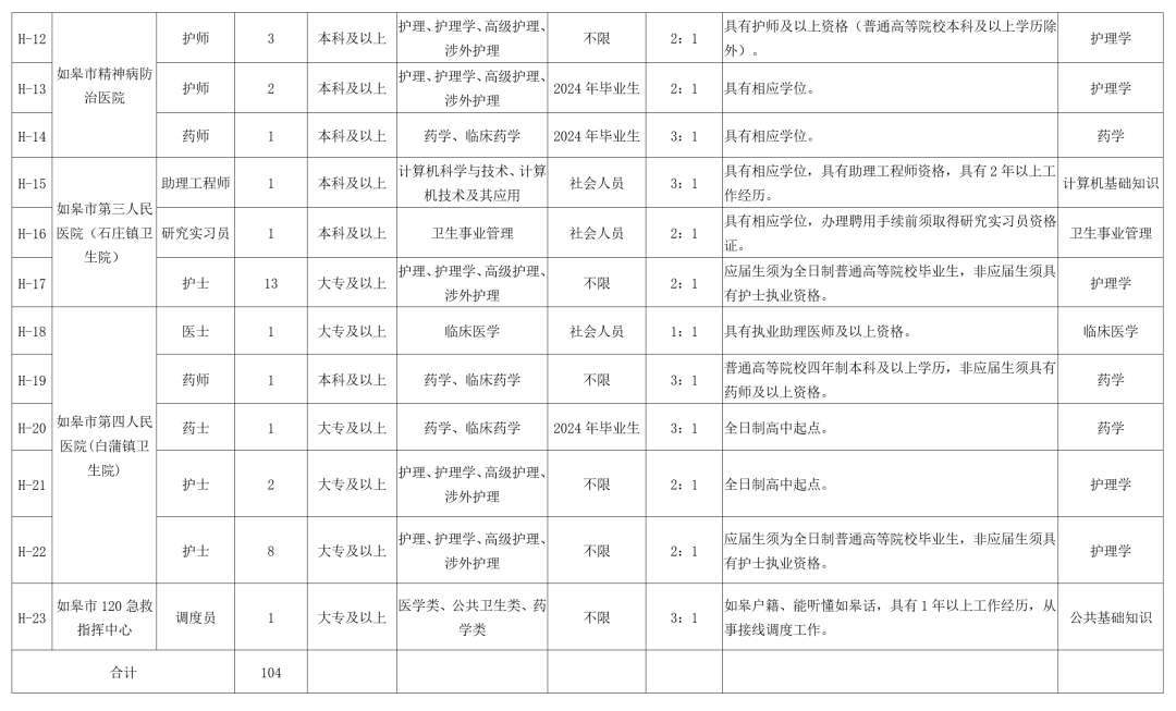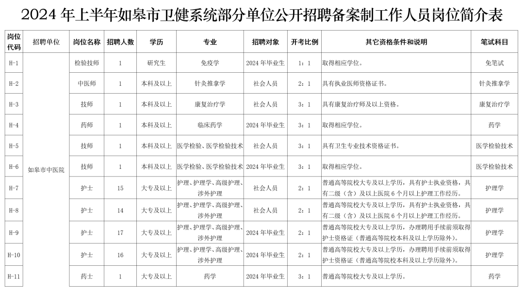为选拔优秀适岗人才,优化人员队伍结构,经研究决定,如皋市卫健系统部分单位面向社会公开招聘备案制工作人员104名。现将有关事项公告如下: 具体的招聘岗位、人数、资格条件等详见《2024年上半年如皋市卫健系统部分单位公开招聘备案制工作人员岗位简介表》(附件1,下称《岗位简介表》)。 上下滑动查看更多 (一)资格条件 1.具有中华人民共和国国籍,遵守中华人民共和国宪法和法律,拥护中国共产党领导和社会主义制度,具有良好的品行。 2.具备正常履行职责的身体条件。 3. 1988年5月至2006年4月期间出生;具有研究生学历及学位的人员以及依法退出现役的退役军人应聘,放宽至1983年5月以后出生。招聘岗位条件中有工作经历要求的,是指截止的累计2024年5月工作经历(按月计算)。 4.具备拟报考岗位要求的资格条件。 (1)资格条件中的“2024年毕业生”,指在2024年毕业并已取得学历(学位)证书,且仍无工作单位的人员。其中,能够提供《毕业生就业推荐表》(原件)的普通高校毕业生,取得学历(学位)证书的日期可放宽至2024年8月31日。 2022年和2023年普通高校毕业生,若仍未落实工作单位,其档案关系仍保留在原毕业学校,或保留在各级毕业生就业主管部门(毕业生就业指导服务中心)、人才交流服务机构和公共就业服务机构的,以及国(境)外同期毕业且已完成学历认证但仍未落实工作单位的人员,可应聘面向2024年毕业生岗位。 参加基层服务项目的人员,如参加服务项目前无工作经历,服务期满且考核合格后2年内的,可应聘面向2024年毕业生岗位。 以普通高校应届毕业生应征入伍服义务兵的人员,退役后1年内的,可应聘面向2024年毕业生岗位。 依据《国务院办公厅关于加快医学教育创新发展的指导意见》(国办发〔2020〕34号)第16条规定,面向社会招收的普通高校应届毕业生培训对象,住院医师规范化培训合格当年在医疗卫生机构就业的,在招聘中按当年应届毕业生同等对待。 (2)资格条件中“专业”的设置目录为《江苏省2024年度考试录用公务员专业参考目录》。专业条件中还包括部分未列入专业参考目录但确有高等学校开设且有事业单位需要的专业。专业名称已经调整的专业,如调整前或调整后的专业符合招聘岗位的专业要求,毕业院校以书面形式证明调整前后的专业为同一专业或专业课程基本一致,视为符合专业要求。 5.报考已实行执业准入资格制度岗位的人员,如符合本公告有关规定暂未取得相应执业或技术资格的,须在聘用后1年内取得相应执业资格或技术资格,否则予以解聘。 6.取得祖国大陆全日制普通高校学历的台湾学生和取得祖国大陆承认学历的其他台湾居民应聘时按国家和江苏省的有关规定执行。 7.岗位要求的其他条件。 (二)不得报考情形 1.现役军人或国民教育序列普通高校在读非2024年毕业生; 2.尚未解除纪律处分或者正在接受纪律审查的人员,刑事处罚期限未满或者涉嫌违法犯罪正在接受调查的人员; 3.《事业单位人事管理回避规定》明确应当回避的岗位; 4.国(境)外留学毕业但截至报名前未取得教育部留学服务中心出具的《国(境)外学历学位认证书》的; 5.国家和省另有规定不得应聘到事业单位有关岗位的人员。 (一)招聘岗位 招聘单位、岗位、对象、人数、专业、学历及要求等具体信息,详见《岗位简介表》。岗位简介表在如皋市人民政府网站市人社局网页(http://www.rugao.gov.cn/rgsrsj/sydwzl/sydwzl.html,下同)、市卫健委网页(http://www.rugao.gov.cn/rgswjw/xxgk/xxgk.html,下同)公告。 (二)报名时间及地点 报名时间:2024年6月3日-6月4日上午9:00至11:30,下午2:00至5:00。 报名地点:如皋市公共卫生中心3楼报告厅(如城街道大司马南路120号) (三)报名方式 本次招聘采取现场报名方式,应聘者在规定的时间到报名点现场报名,也可委托他人代为报名或受他人委托代为报名,受委托人除提供委托人的报名材料外,还需提供委托人的委托书原件(须由委托人本人手写签名)、身份证的原件及复印件。如因委托书非委托人本人手写签名而引起的一切争议或纠纷后果均由委托双方自行解决,与招聘单位无关。 (四)报名注意事项及资格审查 应聘人员只能选择一个岗位报名,必须使用在有效期内的第二代居民身份证,并与考场使用的身份证一致。应聘者报名时须提交下列材料:①本人近期一寸免冠正面彩照1张;②报考人员本人签字的《2024年上半年如皋市卫健系统部分单位公开招聘备案制人员报名登记表》一份(附件2,可下载);③本人有效期内的第二代身份证原件及复印件;④学历证书(外省院校另须提供学信网二维码学历认证)原件及复印件;⑤岗位要求的其他相关证明材料原件和复印件;⑥如皋市内医疗卫生机构工作人员报名须取得单位同意,出具加盖单位公章的同意报考证明。(现场不提供复印服务) (五)由如皋市卫生健康委员会(以下简称市卫健委)对报考人员的资格条件进行审核。通过资格审核的人数与该岗位招聘人数达到规定比例方可开考。达不到开考比例则相应核减或取消该岗位招聘计划,核减或取消岗位情况在如皋市人民政府网站市卫健委网页公告,由市卫健委负责告知有关人员,并允许其改报本公告其它符合条件的岗位。改报时间:2024年6月5日上午8:30-9:00,改报地点:如皋市公共卫生中心1309室。 (六)资格审查贯穿招考工作全过程。在招考各环节发现报考者不符合报考资格条