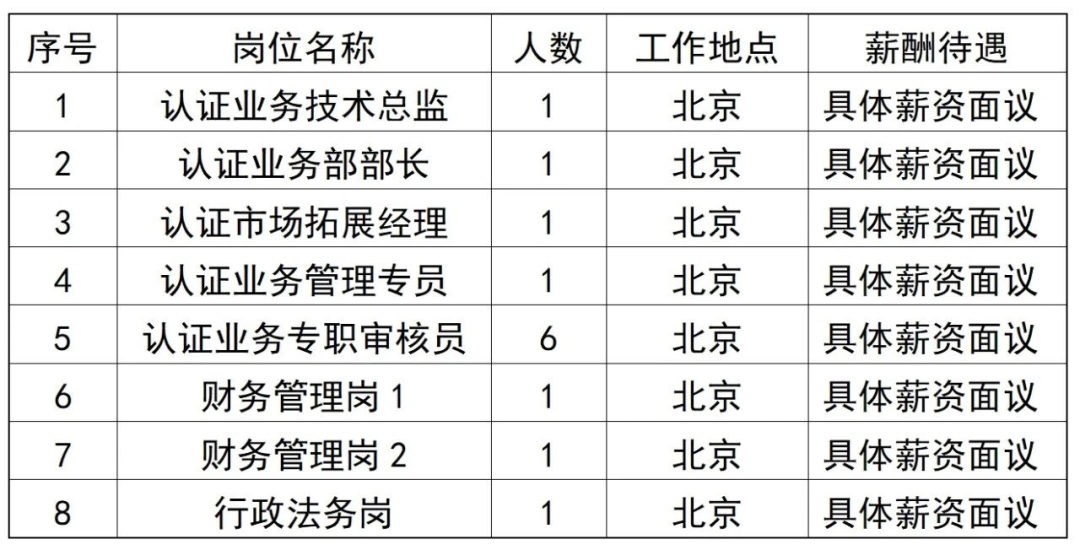 认证业务技术总监、认证业务部部长、认证市场拓展经理、认证业务管理专员、认证业务专职审核员、财务管理岗、行政法务岗,共计8个岗位13人。