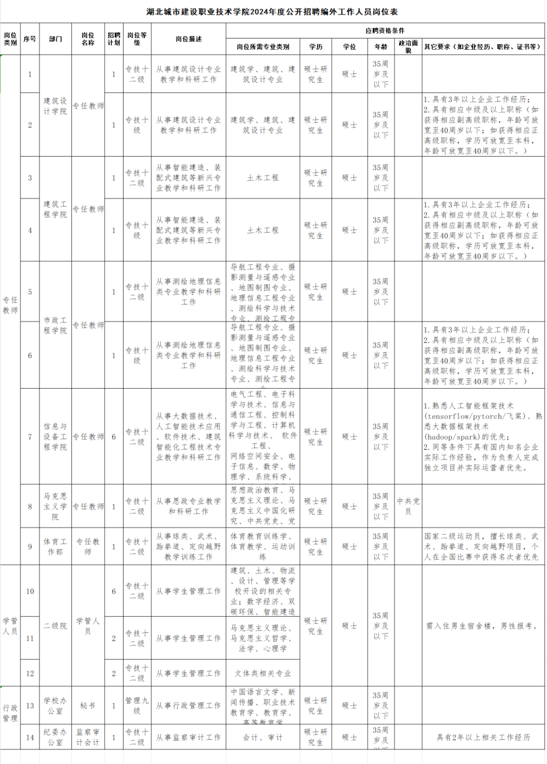 附件1:湖北城市建设职业技术学院2024年度公开招聘编外工作人员岗位表