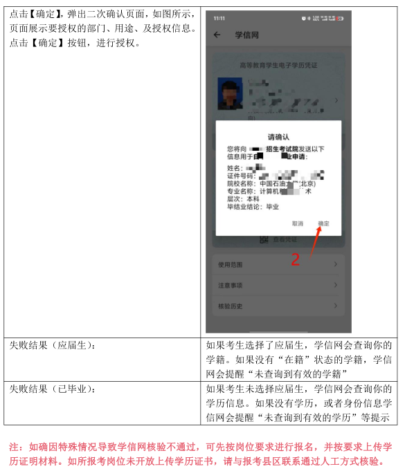 核验失败学信网验证状态如下(如确因特殊情况导致核验不通过,可先按岗位要求进行报名,并按要求上传学历证明材料。如所报考岗位未开放上传学历证书,请与报考县区联系通过人工方式核验):