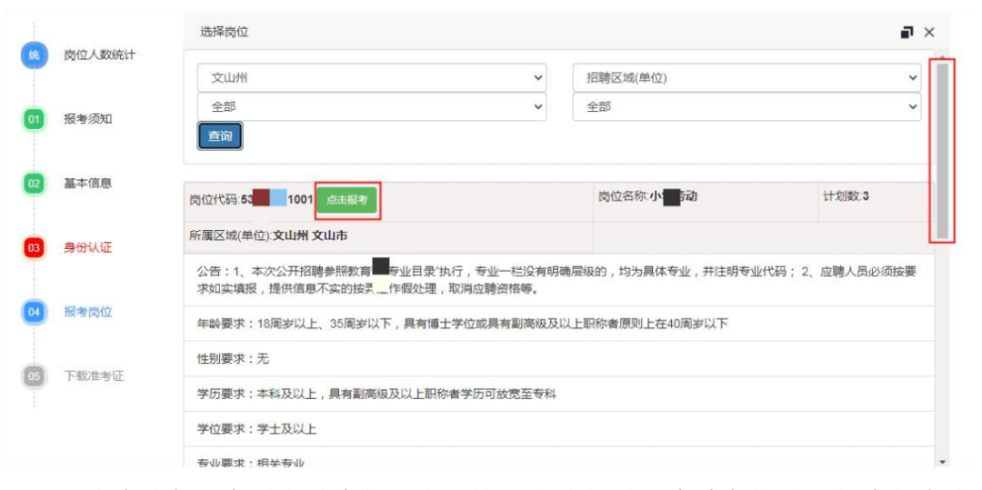 滑动滚动条,查看岗位信息,点击拟报考岗位的“点击报考”,进入报考岗位及材料上传页面,如下图所示。