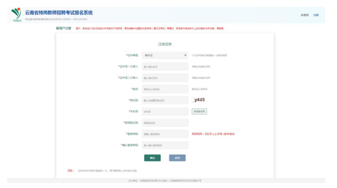 进入注册页面后,输入证件号一次录入、证件号二次录入、姓名、验证码、机号、短信验证码、登录密码、确认登录密码,点击“确定”,如下图所示