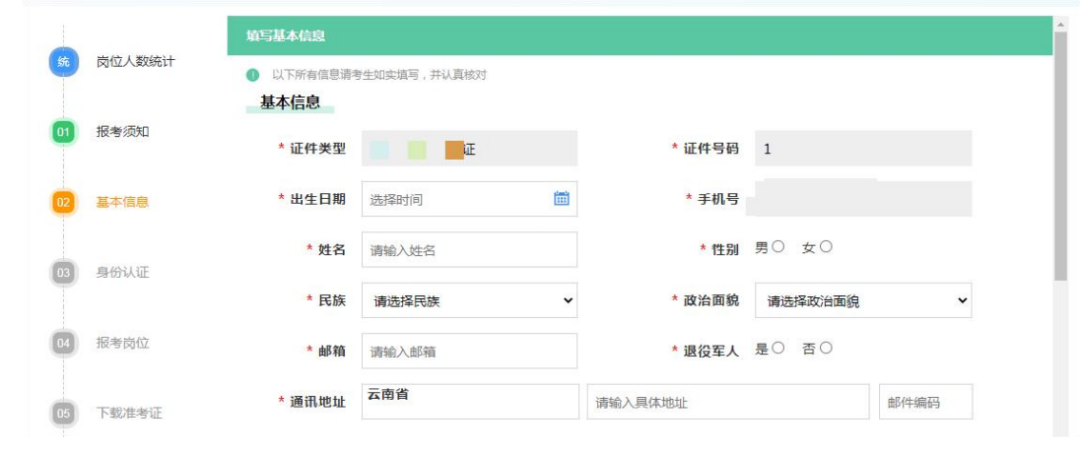 点击“基本信息”,进入到填写基本信息页面。按照实际情况输入基本信息中所有内容,点击“保存并继续”,保存所填信息。证件类型、证件号码、出生日期、手机号为注册时填写信息,不可修改,如下图所示。