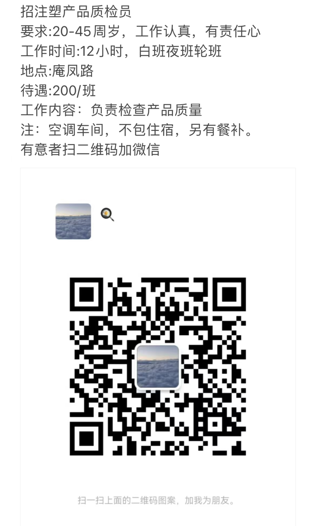 28男,庵埠本地。之前从事食品厂几年,因疫情原工厂没做。现找一份能够傍晚18点前或18点下班,晚上不用加班的工作,因晚上有兼职在做。微信ansans666