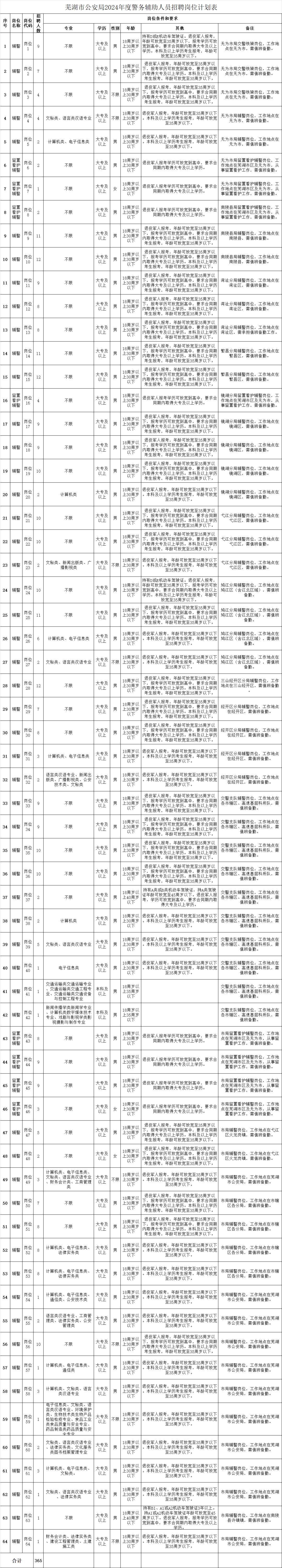芜湖市公安局根据工作需要,面向社会公开招聘365名警务辅助人员(以下简称辅警)。现就有关事项公告如下: