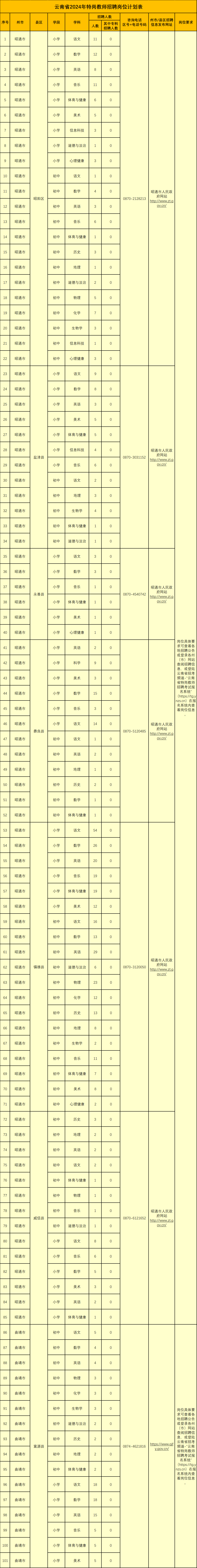 根据《教育部办公厅 财政部办公厅关于做好2024年农村义务教育阶段学校教师特设岗位计划实施工作的通知》(教师厅〔2024〕1号)和《云南省教育厅 云南省财政厅 云南省人力资源和社会保障厅 中共云南省委机构编制办公室关于印发〈云南省农村义务教育阶段学校教师特设岗位计划实施方案〉(2012年修订)的通知》(云教人〔2012〕28号)精神,现将云南省2024年特岗教师招聘考试有关事项公告如下:一、招聘计划发布