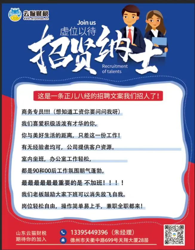 现招聘电话销售业务员,25-45岁,高中以上学历,带薪实习,转正快,一天工作8小时,公司有餐厅,中午免费工作餐,月带薪公休4天,,五险,无责任底薪,