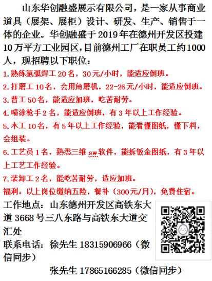 4、生产主管:1人,需要有车间生产管理经验,试用期3个月,工资面议。