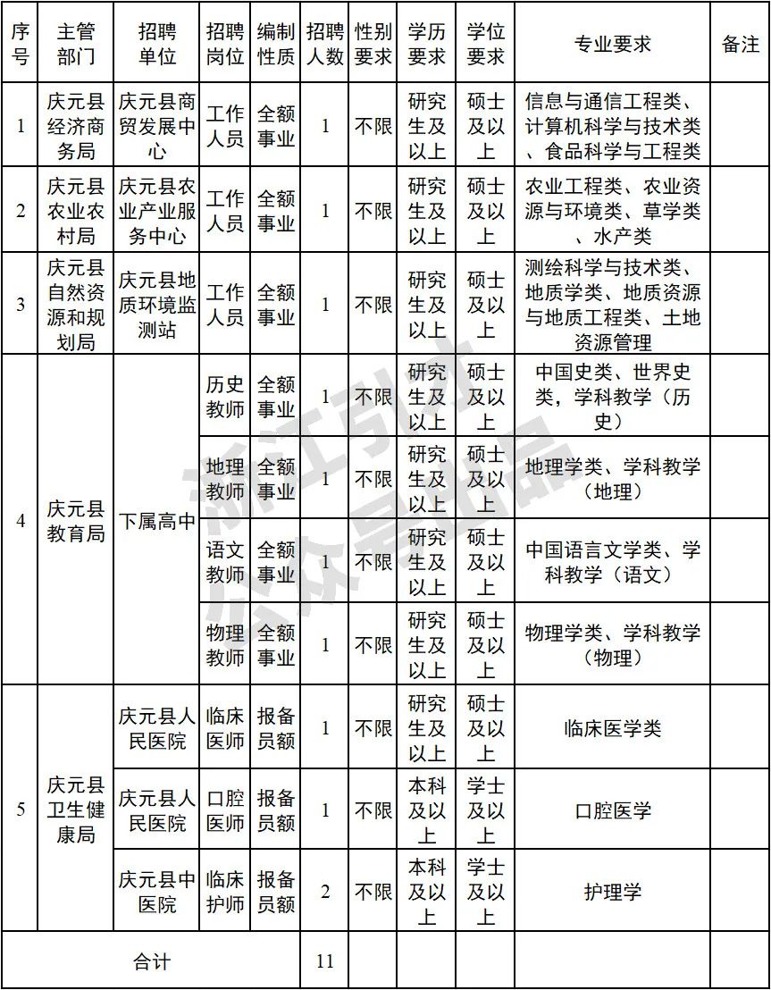 为加强“三支队伍”建设,特别是高素质干部队伍建设,根据《事业单位人事管理条例》《浙江省事业单位人员招聘暂行办法》,经研究,决定面向社会招聘部分紧缺专业人才。现将有关事项公告如下:本次人才招聘计划共11名,具体招聘单位、岗位、人数和资格要求等详见《2024年庆元县紧缺专业人才招聘需求计划表》。报名人员除应具备招聘岗位所需的资格要求(详见计划表)外,还需符合以下条件:2.拥护中国共产党的领导,热爱社会主义,政治立场坚定,遵纪守法,品行端正。3.年龄35周岁及以下(1988年6月12日以后出生);博士研究生40周岁及以下(1983年6月12日以后出生)。具体的招聘单位、岗位、专业要求、人数等详见招聘岗位需求计划表,也可登录庆元县人民政府网公示公告栏查询。贯彻公开、平等、竞争、择优的原则,坚持德才兼备、以德为先的用人标准,采取公开报名、统一考试、严格考察、择优聘用的方式进行,本次招聘按岗位进行报名考试,具体程序如下:本次招聘采用邮件报名方式进行,考生将报名资料电子稿压缩成单个文件包发送至庆元县人力资源和社会保障局电子邮箱:qyrsj_bgs@163.com,邮件名称统一以“报名单位+岗位+姓名+专业”命名,报名时间为公告发布之日起至2024年6月12日截止。《庆元县紧缺专业人才招聘报名表》;本人身份证、学历学位证书复印件;2024届毕业生需提供学校核发的就业推荐表或教育部学生司制发的《全国普通高校毕业生就业协议书》等相关证件(证明)复印件;国(境)外已取得学历学位的报考人员应提供教育部中国留学服务中心出具的境外学历、学位认证书复印件。未取得学历学位证书的报考人员,须于2024年8月31日前取得学历学位证书,如未能按时取得相应证书的,取消聘用资格。3.注意事项:每位考生限报一个岗位。考生应对自己所填报资料的真实性负责,诚实应聘。对伪造、涂改证件、证明,或以其它不正当手段获取应聘资格、考试考察过程中作弊等违反公开招聘纪律的应聘人员,将取消应聘资格,对已聘人员,一经查实,即予解除聘用合同。报名结束后,招聘单位及其上级主管部门根据招聘岗位所需条件对报名人员进行资格审查,经资格审查合格,通知符合招聘条件的人员参加面试。请各应聘人员在此期间保持手机畅通,否则,视为应聘人员自动放弃本次面试资格。教师岗位面试采用模拟课堂的方式进行,其它岗位面试采用结构化面试方式进行,面试总成绩满分为100分,合格分为70分,不合格者不能列入体检、考察对象(面试具体时间、地点另行通知)。报考人数达到1:3比例及以上的岗位,按面试成绩从高分到低分按1:1的比例确定入围体检人员;报考人数达不到1:3比例的岗位,则根据报考人员的岗位匹配性由用人单位会同组织人事部门商定是否入围面试,再根据面试成绩从高分到低分按1:1的比例确定入围体检人员。体检由县组织人事部门统一组织实施。体检、考察参考公务员体检、考察的有关规定执行。体检以指定医院的结论为准。体检费用自理,体检时间另行通知,考生不按规定时间、地点参加体检的,视作放弃体检。考察结果仅作为本次是否录用的依据。考察由招聘单位组织实施,考察参考《公务员录用考察办法(试行)》(中组发〔2021〕11号)执行。体检、考察有放弃或不合格的,在该岗位面试合格人员中按成绩从高分到低分依次递补。体检、考察工作实施前,国家出台新规定的,按新规定执行。体检、考察后,根据体检、考察结果,按面试成绩从高分到低分择优确定聘用对象。拟聘用对象在庆元县政府门户网站公示。公示期满后,没有反映问题或反映有问题经查不影响聘用的,办理聘用手续。对反映有影响聘用的问题并查有实据的,不予聘用;对反映的问题一时难以查实的,将暂缓聘用,待查清后再决定是否聘用。报考人员在接到聘用通知后,必须在规定的时间内报到。无正当理由逾期者,取消聘用资格。无正当理由不能在2024年8月31日前向县人力社保部门提供报考所需毕业证书(2024年全日制普通高校应届生)及其他材料的,不予聘用。岗位聘用实行最低服务年限制度,最低服务年限为5周年(含试用期),有规范化培训要求的,服务年限不含规范化培训时间。报考人员资格审核贯穿本次人才招聘工作全过程。报考人员提交的报名信息应当真实、准确、有效。凡提供虚假信息和材料,或有意隐瞒本人真实情况的,一经查实,即取消聘用资格。本次人才招聘有关信息在以下指定网站公布,供应聘者查询和社会监督:本公告由中共庆元县委组织部、庆元县人力资源和社会保障局负责解释。联系电话:庆元县人力资源和社会保障局 0578-6012571;ps:敬请投递时标注信息来于"杭州微招"公众号,谢谢!