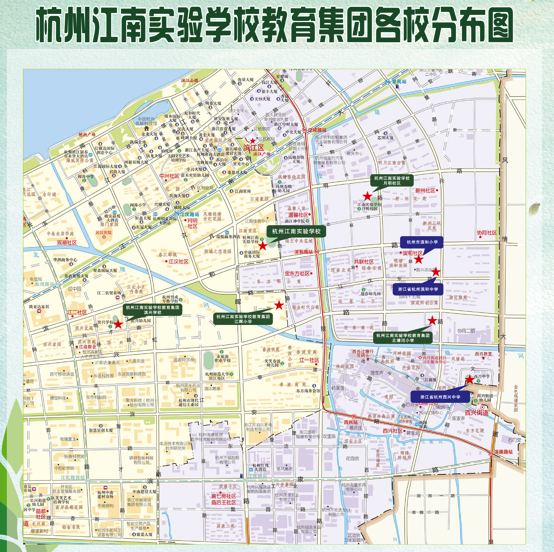 杭州江南实验学校位于滨江区滨和路,占地8.3公顷,是杭州市滨江区教育局和杭州二中教育集团于2005年合作创办的一所九年一贯制实验学校,现有教师350名、学生5300名,校长金晓东。校园环境山水葱郁、清逸雅秀,一湾浅水,双虹卧波,群贤启梦,晨钟伴读,清幽雅致的竹荫小径,满地金黄的银杏叶子,独具匠心的二十四节气亭……江南山水的诗意盎然和读书之处的宁静致远融合成江南独有的文化气质。