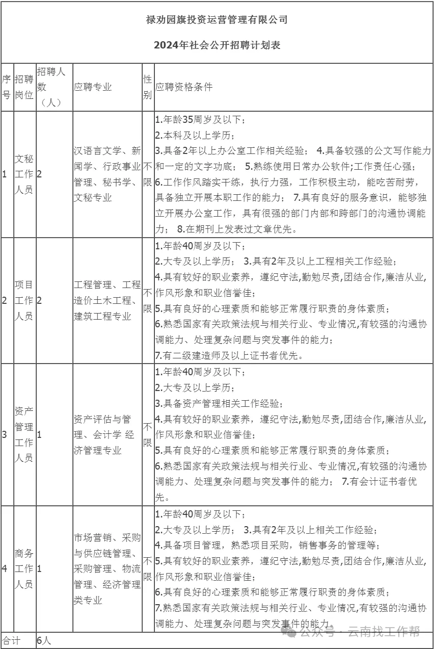 此次计划招聘人数为6人,其中:综合管理部文秘工作人员2人,项目管理部工作人员2人,资产运营管理部工作人员1人,商务部工作人员1人。详见《附件:禄劝园旗投资运营管理有限公司2024年社会公开招聘计划表》。