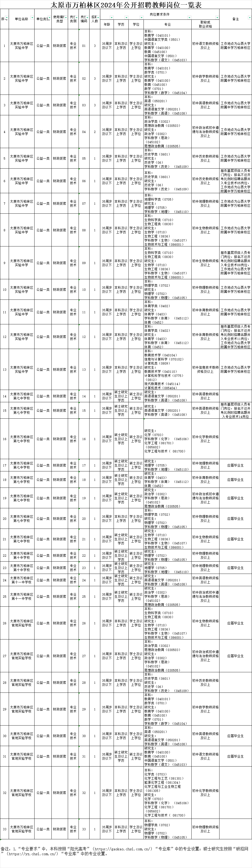 为进一步加强万柏林区教师队伍建设,经研究,决定为太原市万柏林区公开招聘教师40人,现将有关事项公告如下:本次共招聘教师40人,具体岗位条件及名额见《太原市万柏林区2024年公开招聘教师岗位一览表》(以下简称《岗位一览表》)(附件)。招聘对象为符合招聘条件和岗位所需具体要求的高校毕业生(不含2024年毕业的委培生、定向生)、职业院校(含技工院校)毕业生、服务基层项目人员。6.已就业人员报考时,须征得本单位同意(公务员、参照公务员法管理的事业单位工作人员和事业单位工作人员还需征得主管部门以及具有人事管理权限部门的同意)。1.现役军人,在读的非2024年应届毕业生不得以原取得的本科或研究生学历学位报考;2.因犯罪受过刑事处罚的、被开除中国共产党党籍或被开除公职的、在立案审查期间或未解除党纪政纪处分的;3.在各级公务员招考和事业单位招聘中被认定有舞弊等严重违反考录、招聘纪律行为的;4.试用期内的公务员(参照公务员法管理的事业单位工作人员)和试用期内的事业单位工作人员;5.机关事业单位工作人员有服务年限规定且服务期未满的;7.法律法规规定不得报考或聘用为事业单位工作人员的;8.报考者不得报考聘用后即构成《事业单位人事管理回避规定》第六条所列情形的岗位。年龄在18周岁以上、35周岁以下(即1988年5月27日至2006年5月27日期间出生)。具备岗位所要求的学历学位。报考者的学历需国家教育行政部门认可。本次招聘专业要求按照教育部最新公布的本科和研究生招生专业设置。其中本科按照“阳光高考”专业知识库设置、研究生按照“中国研究生招生信息网”专业知识库设置。高校自主设置的研究生专业、国(境)外学历学位的专业、技工院校专业等未列入的,由负责资格审查部门根据学科代码、主要课程、研究方向等进行认定。历次本科专业目录调整、学位授予和人才培养学科目录调整、专业学位领域调整前的专业,按照调整前后的对应关系认定。4.根据相关要求,本次公开招聘设置应届毕业生专门岗位、服务基层项目人员专门岗位。应届毕业生专门岗位的报考对象包括:纳入国家统招计划、被普通高等院校录取的2024年应届高校毕业生(2024年7月31日前取得相应的学历和学位证书);参加服务基层项目前无工作经历、服务期满且考核合格后2年内的人员;国家统一招生的普通高校毕业生离校时和在择业期内(国家规定择业期为二年)未落实工作单位,其户口、档案、组织关系仍保留在原毕业学校,或者保留在各级毕业生就业主管部门(毕业生就业指导服务中心)、各级人才交流服务机构和各级公共就业服务机构的毕业生;2022年1月1日至2024年7月底前取得国(境)外学位并完成教育部门学历学位认证且未落实工作单位的留学回国人员;退役一年内的高校毕业生退役士兵。服务基层项目人员专门岗位的报考对象包括:参加“大学生志愿服务西部计划”(含晋西北计划)到2023年8月底前服务期满、考核合格的人员和参加我省“选聘大学生村官工作”(不含2018年以后录用的选调生)、“农村义务教育阶段学校教师特设岗位计划”、“三支一扶”计划、“农业技术推广服务特设岗位计划”等到2024年5月底前服务期满、考核合格的人员;劳动合同期满、考核合格的省政府购买基层公共服务岗位人员;在军队服役5年(含)以上的高校毕业生退役士兵。5.按照国家和我省有关政策规定,港澳地区的中国公民和台湾同胞在事业单位公开招聘中享有公平竞争权利,可应聘到内地事业单位就业。6.所有岗位均要求报考者具有教师资格证,且报考者教师资格证书的学科学段应与岗位要求的学科学段一致;同学科高学段教师资格证可向下融通。纳入国家统招计划、被普通高等院校录取的2024年应届高校毕业生在报名时未取得毕业证、学位证的需出具毕业学校开具的学历和学位证明(注明专业),未取得教师资格证的出具《中小学教师资格考试合格证明》或《师范生教师职业能力证书》。其余人员的毕业证、学位证、教师资格证以及招聘岗位所要求的各类证书须于公告发布之日(不含公告发布当日)前取得。上述招聘条件审查贯穿招聘全过程,报考者报名时提交的信息和提供的有关材料须真实有效。凡发现报考者与拟聘用岗位所要求的资格条件不符以及提供虚假材料的,即取消其考试、聘用资格。招聘程序为发布公告、网上报名及资格初审、笔试、资格复审、面试、体检、考察、公示和审批聘用。招聘公告在山西省人力资源和社会保障厅网站(rst.shanxi.gov.cn)和万柏林区人民政府网站(www.sxtywbl.gov.cn)发布。招聘公告发布后,其他相关事宜及后续通知、公告等将在万柏林区人民政府网站和招聘报名网站(wbl2024.tyzkpt.com)予以发布。本次考试报名采取网络报名的方式进行,报考者通过万柏林区人民政府网站上的相关链接或招聘报名网站登录招考平台报名。报名时间:2024年6月3日9:00至2024年6月7日17:00,报考者只能选择一个岗位进行报名,报名与考试时使用的本人有效居民身份证必须一致。报名时所填写的专业应当与报考者本人取得的毕业证书上所载明的专业一致,留学回国人员应当与学历学位认证书上所载明的专业一致,研究生如毕业学校按照一级学科发放毕业证,须如实填写毕业证所载一级学科名称,并注明所学专业(研究方向)。报名时,报考