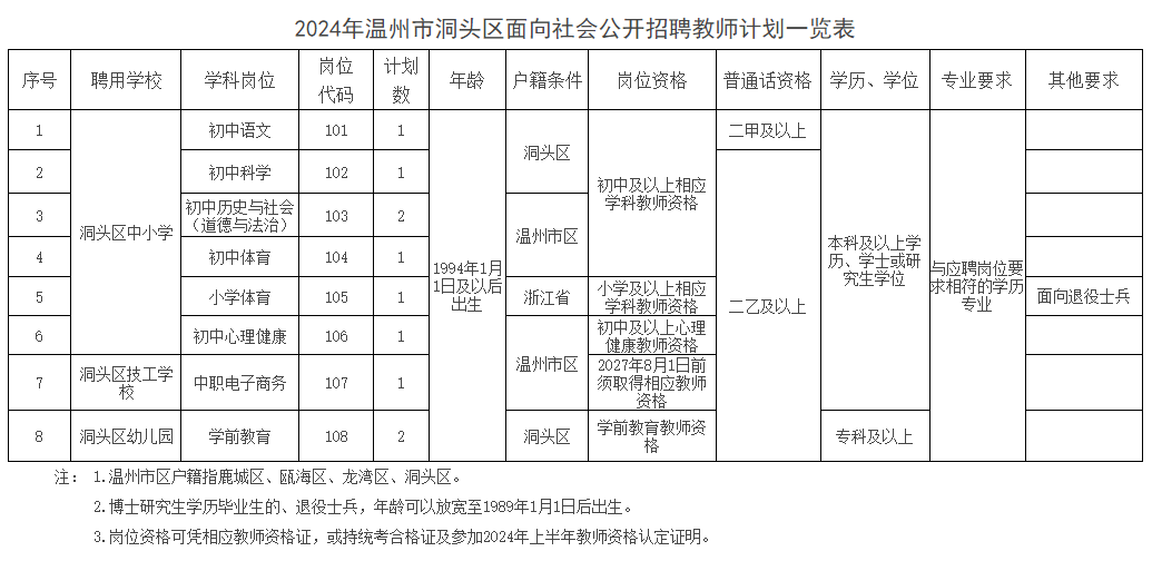 招聘单位、具体岗位和要求详见《2024年温州市洞头区面向社会公开招聘教师计划一览表》。