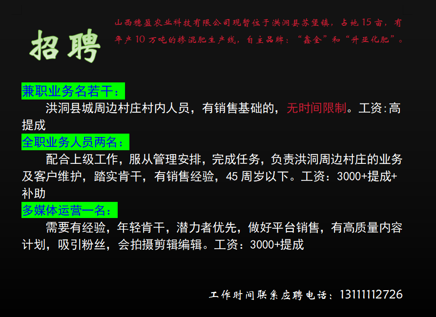 质信阀门招聘 洪洞客服体验中心招聘 薪资待遇:综合平均薪资3500-6000(五险一金+生日福利+全勤+年假+法定节假日)有晋升空间任职要求:18-35周岁,中专及高中以上学历,男女不限;3.可接受残障人士(持有残疾证,能正常沟通,使用电脑打字)薪资福利:月薪10-15k,做五休二,8小时工作制,五险一金,可接受出差岗位要求:有3年以上呼叫中心客服相关经验,2年以上管理工作经验者优先 要求:年龄20-45岁,有爱心,有责任心,有团队精神和事业心地址:洪洞县朝阳西街西口(飞虹影剧院往西200路北)跨视界护眼中心沣宇元商贸有限公司因业务扩大,现招聘业务人员4名,招聘信息:山西湖邦食品有限公司现招聘办公室助理三人。要求大专以上学历,普通话标准,会电脑操作,可以长期工作的女士。 工作地点,临汾市洪洞县万安镇西梁村 联系方式,17835194111 联系人,张经理 穗盈农业科技招聘 招聘兼职:各村兼职人员,闲余时间,不出村就可以多赚钱。