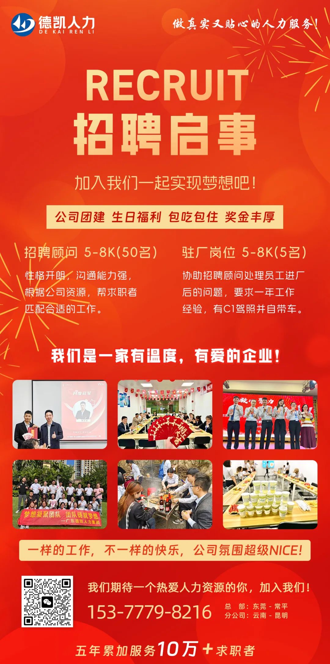 ![]() ![]() 广东德凯集团总部位于广东省东莞市常平镇土塘大道文耀商务大楼二楼218-220室,旗下包括广东德凯人力资源服务有限公司和广东南粤铭师教育研究有限公司。 公司主要从事劳务派遣、人力资源开发、农民工输出、学生实习就业、中小学幼儿园校(园)长培训、学历提升。 公司自成立以来,立足于珠三角地区,面向全国,与近 200 余家人力资源公司、教育系统各级机构达成战略合作,为电子制造、电商物流、智能制造业、国有事业单位等100多家企事业单位提供专业优质的服务! 新时代新担当新使命!德凯集团一直致力于对社会信息资源的全方位整合,将全力以赴为众多的优秀企业和单位提供更优质,更完善的服务! ![]() 1、业务主管 2名 薪资待遇:10K~25K 1、岗位职责: (1)了解公司合作企业,制定招聘计划 2、任职要求: (1)年龄20-38岁,本科及以上学历(能力强可放宽条件); (3)擅长员工关系管理及应急突发事件处理,有一定的数据统计能力及计算机基本操作技能; (4)较强的沟通、表达、组织、协调能力、有大局观,执行力及原则性强; 3、业务组长 5名 薪资待遇:8K~15K 1、岗位职责: (1)制定组员目标,带领小组完成 2、任职要求: (1)年龄20-30岁,大专及以上学历。(能力强可放宽条件) (3)擅长员工关系管理及应急突发事件处理,有一定的数据统计能力及计算机基本操作技能; (4)较强的沟通、表达、组织、协调能力、有大局观,执行力及原则性强; 4、驻厂 5名 薪资待遇:5K~15K 1、岗位职责: (1)员工入职管理:包括入职培训、合同签订、银行卡办理; (2)员工在职管理:各类报表数据提供,员工借支及薪资管理、异常处理等; (3)员工离职管理:涉及员工撤离、转正、离职等业务办理; (4)客户关系维护及员工劳资关系处理; 2、任职要求: (1)年龄20-35岁,高中及以上学历,有c1驾驶证及自带车; (3)擅长员工关系管理及应急突发事件处理,有一定的数据统计能力及计算机基本操作技能; (4)较强的沟通、表达、组织、协调能力、有大局观,执行力及原则性强; 2、招聘顾问 50名 薪资待遇:5K~10K 1、岗位职责: (1)负责线上资源跟进转化; 2、任职要求: (1)20-32岁,有同行经验或者销售、业务型工作经验优; (2)形象气质佳,性格开朗、阳光、自信、善于与人交流、工作勤奋、积极、主动; (3)具备良好的表达能力和沟通技巧,有一定的抗压能力及团队协作意识,具有良好的服务意识及职业道德。 3、薪资与办公环境 (1)无责底薪+提成+全勤+绩效+奖金【综合工资5000-10000元以上,上不封顶。(上六休一)】 (2)室内办公,环境优雅,提供中晚双餐。 德凯福利待遇 公司荣誉 工作环境和日常