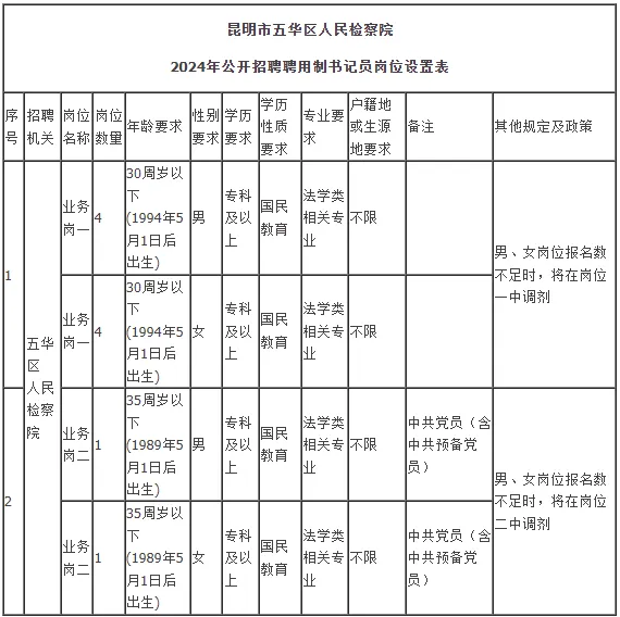 点击上方"昆明工作猫 "关注即可查看昆明招聘信息! ![]() ![]() ![]() 根据工作需要,昆明市五华区人民检察院委托上海外服(云南)人力资源服务有限公司公开招聘聘用制书记员10名。现将有关事项公告如下: 一、招聘计划 (一)本次计划招聘聘用制书记员10名; (二)岗位设置详见《昆明市五华区人民检察院2024年公开招聘聘用制书记员岗位设置表》(以下简称《岗位设置表》)。 二、招聘条件 (一)报考人员应当具备下列条件: 1.具有中华人民共和国国籍; 2.拥护党的理论和路线方针政策,具有良好的政治素养、专业能力和职业操守; 3.具备国民教育专科及以上学历; 4.具体年龄要求详见《岗位设置表》; 5.掌握岗位必需的业务技能; 6.具有正常履行职责的身体条件; 7.法律、法规规定的其他条件。 (二)下列人员不得报考: 1.曾因犯罪受过刑事处罚或治安处罚以及纪律处分的; 2.曾被开除公职或者被机关事业单位、国有企业等单位辞退的; 3.涉嫌违纪违法正在接受审查尚未得出结论的; 4.违反社会公德、职业道德,造成不良影响的; 5.有其他不适宜担任聘用制书记员情形的。 三、招聘程序 (一)报名 考生登录上海外服(云南)考试报名系统: http://baoming.rydata.com.cn/,进行注册/登录(首次注册需要填写相关信息,验证手机号码)。选择正在进行的考试或直接点击查看详情进入考试页面,选择岗位后,进行报名。此次报名人数限制240人,报名人数达标后报名截止。 网上报名时间:5月28日—6月2日。 线上资格初审:5月29日—6月3日。 (二)资格审查 考生可在报名系统查看自身审核情况,符合参加笔试资格的人员名单将以公告的形式在昆明市五华区人民检察院微信公众号和“上海外服云南”订阅号进行公告;已报名但未在公告名单中的人员,即未通过资格审查,不再另行通知。 (三)资格复审和考试 1.笔试。笔试采取闭卷的方式,满分100分,内容包括法律基础知识、时事政治等,笔试最低合格分60分。 2.资格复审。根据笔试成绩由高分到低分,按照招聘岗位人数与进入岗位技能测试人数1:3的比例确定参加资格复审人员,人员名单在昆明市五华区人民检察院微信公众号和“上海外服云南”订阅号进行公告。因资格复审不合格或因人员自愿放弃而导致未达到岗位技能测试比例的,按笔试分数从高到低顺序进行递补,递补1批次后仍未达到比例的不再递补,按照实际合格人数开展岗位技能测试。 资格复审采用线下递交原始资料的方式进行,原始资料包括:身份证原件及复印件、毕业证原件及复印件、准考证原件。 3.岗位技能测试。采用上机看打和听打的方式进行。 岗位技能测试成绩计算方式为: (看打成绩〔100分〕+听打成绩〔100分〕)×50%,技能测试最低合格分60分 4.面试。面试成绩满分100分,最低合格分60分。岗位技能测试结束后,按笔试和岗位技能测试成绩之和(笔试成绩+岗位技能测试成绩),按照岗位招聘计划人数与面试人数 1:2 的比例从高分到低分顺序依次确定进入面试人员(含末位并列人员)。进入面试人员自愿放弃面试的,空缺的名额按笔试和岗位技能测试成绩之和(笔试成绩+岗位技能测试成绩),从高分到低分顺序进行递补。递补1批次后仍未达到比例的不再递补,按照实际合格人数开展面试测试。 5.综合成绩计算。报考人员的综合成绩按百分制计算:综合成绩=笔试成绩×30%+岗位技能测试成绩×30%+面试成绩×40%,各类成绩折算如出现小数,按照四舍五入保留小数点后两位计算。如出现综合成绩相同情况,依照面试成绩从高分到低分的顺序确定排名先后,如再出现相同成绩,依照岗位技能测试成绩从高分到低分的顺序确定排名先后。 报考人员综合成绩排名从高分到低分顺序,按照招聘岗位人数和招聘人数1:1的比例确定进入体检和考察环节的人选。 招聘考试其他环节时间和地点另行通知。 (四)体检和考察 1.体检。体检项目和标准按照《公务员录用体检通用标准(试行)》执行。首次体检不合格的可以申请一次复检,以复检结果为最终结论;如报考人员自愿放弃体检或体检不合格的,按综合成绩岗位排名依次递补。 体检和复检费用由考生个人承担。 2.考察。重点对考察对象的政治素养、道德品质、能力素质、遵纪守法、廉洁自律、岗位匹配等情况进行考察。同时要核实考察对象是否符合规定的报考资格条件,提供的报考信息和相关材料是否真实、准确,是否具有报考回避的情形等方面的情况。 考察时需要提交无犯罪记录证明和征信情况证明。 如报考人员自愿放弃考察或考察不合格的,按综合成绩岗位排名依次递补。 (五)公示和聘用 1.公示。根据岗位需要,综合考虑考试和体检考察情况,择优确定拟聘用人选,在昆明市五华区人民检察院微信公众号及“上海外服云南”订阅号进行公示,公示期为5个工作日。 2.聘用。公示后出现放弃情形的,不再参加递补。公示期满后,对没有反映问题或反映有问题但不影响聘用的,依法签订劳动合同;对反映有影响录用的问题并查有实据的,不予签订劳动合同;对反映的问题一时难以查实的,暂缓聘用。为保护个人权益,反映问题时须实名反映。聘用通知下发后,聘用人员应当在规定时间内持有关材料报到。逾期不报到的,取消其聘用资格。 3.递补。根据考试综合成绩排名,按照招聘岗位将进入面试未被聘用且面试成绩在合格分数线以上的人员确定为该岗位的递补候选人,