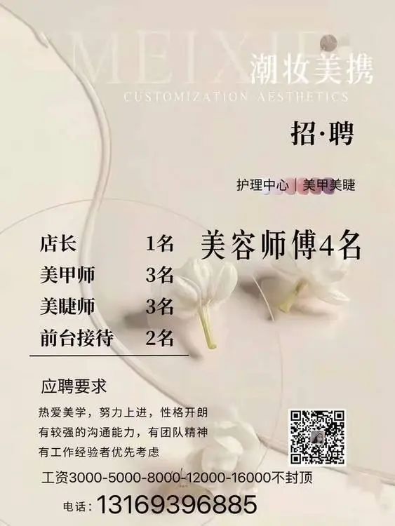 招聘 店长薪资5000—20000 美容师 薪资 3000—12000 美容学徒 2500—5000 美甲美睫师傅3000-12000 地址:广东云浮金濠新天地总店/城北5小金山分店