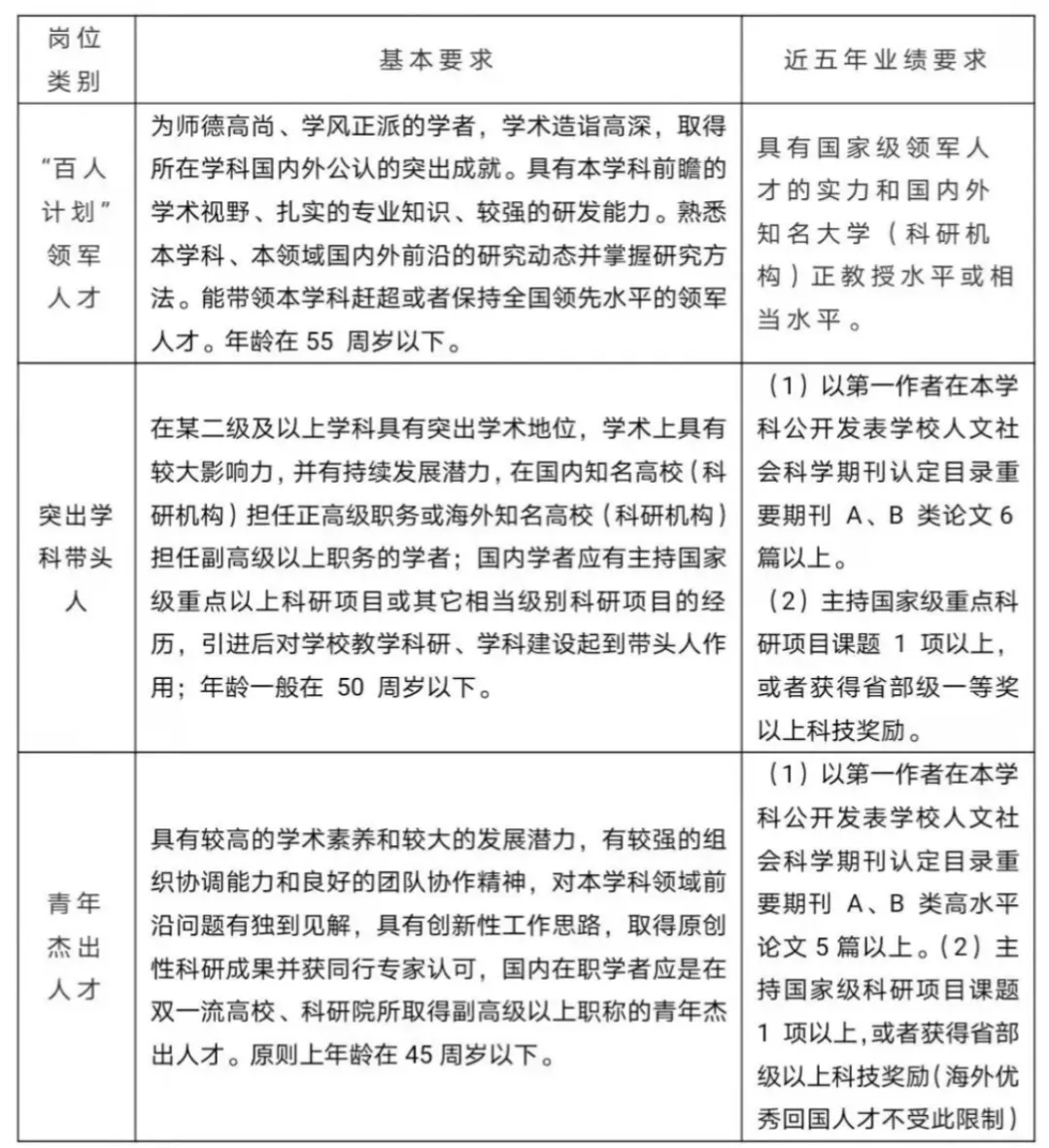 5.“强基计划”专项人才:主要补充师范教育类学科教学论和教学法方向师资(汉语言文学、历史学)。强基重点骨干,取得博士学位和高级专业技术职称,原则上正高级45周岁以下、副高级40周岁以下。强基基础骨干,有较明显的教学水平和潜力,有一定的科研成果,取得博士学位、年龄一般在35周岁以下。强基全职特聘,符合“强基计划”专项范围,近三年取得一定的教学科研成果,具有较明显的教学能力和潜力,经培养能达到校级本科课堂教学优秀奖或能获得省、市级高校青年教师教学技能大赛奖项的教学水平,取得博士学位、原则上年龄在35周岁以下。